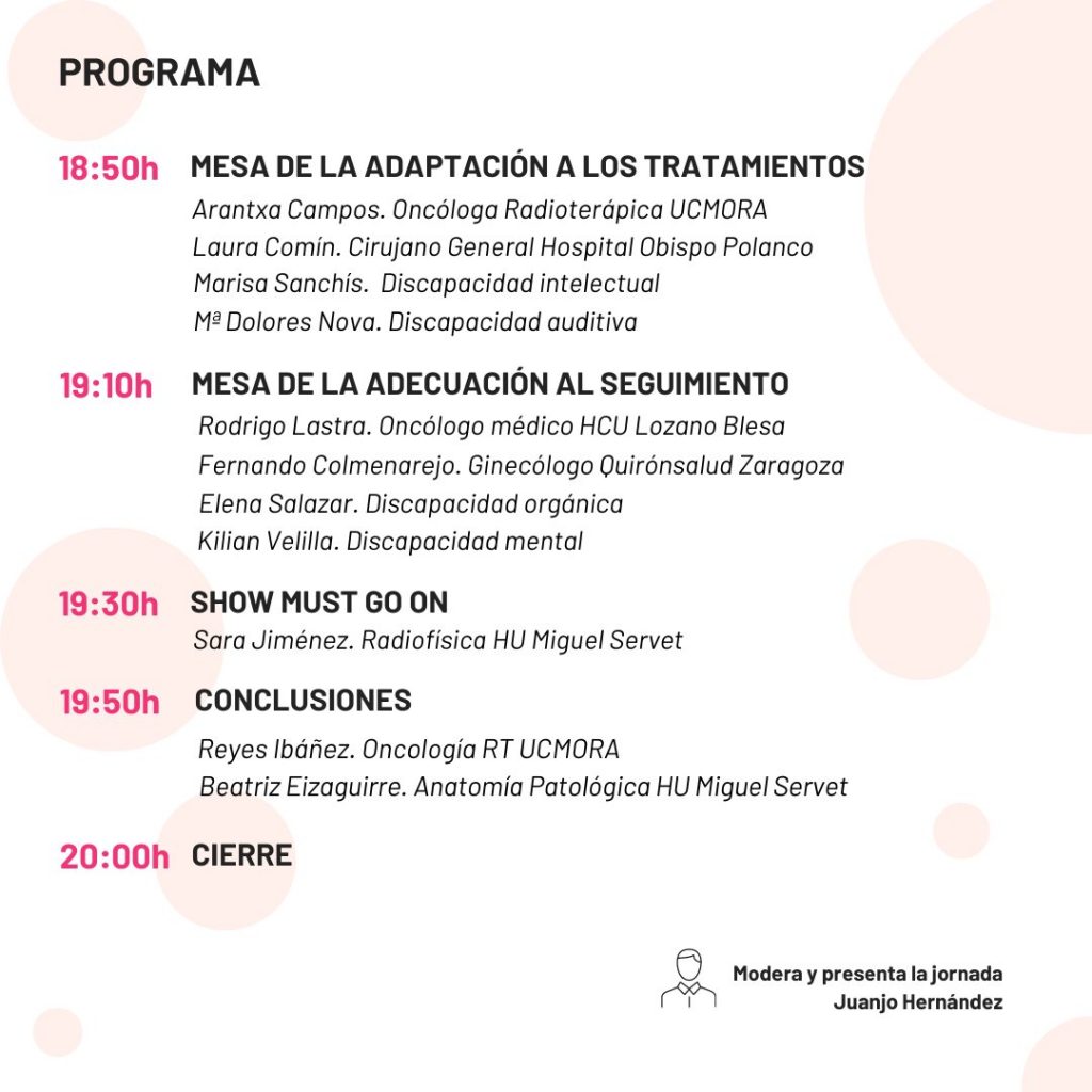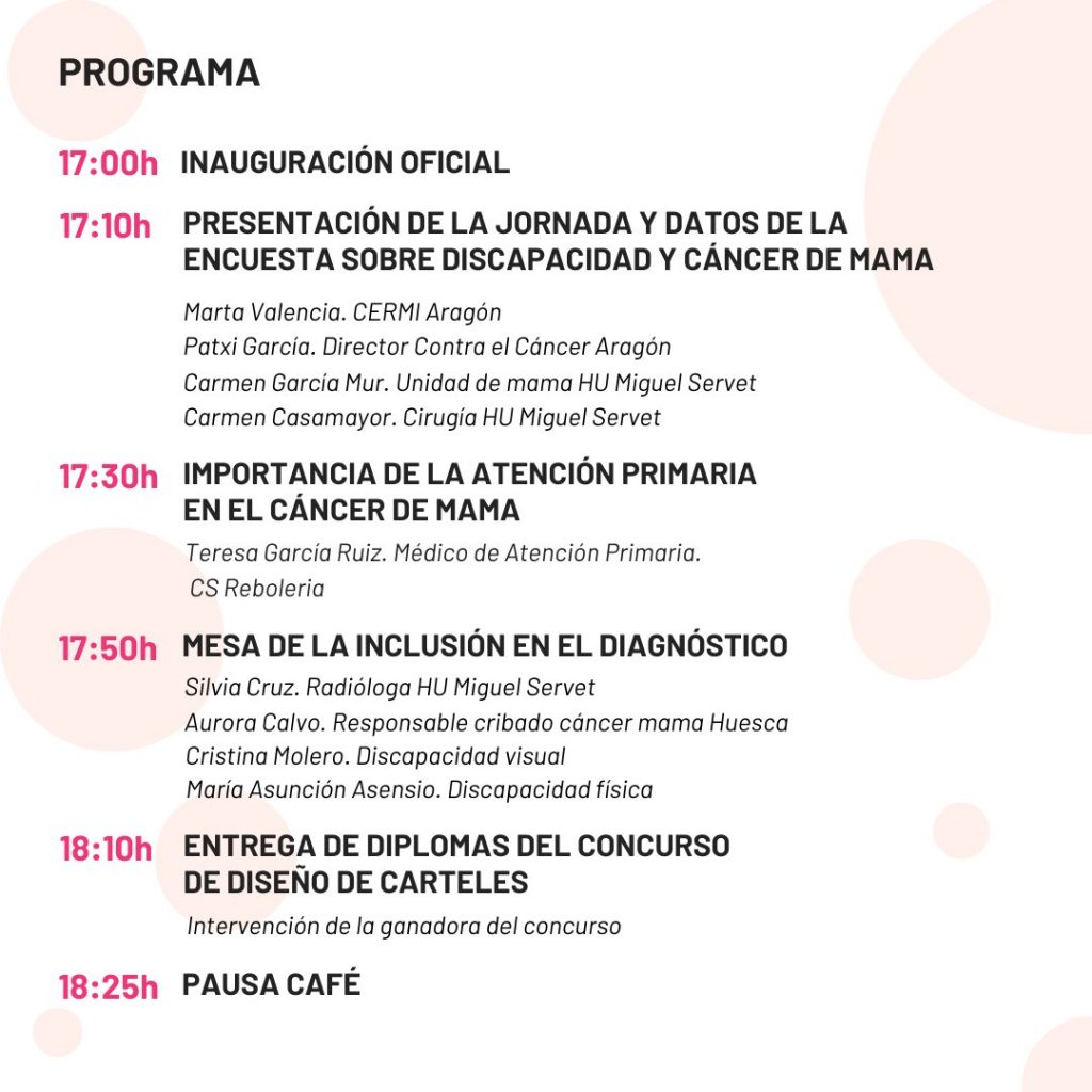 La jornada se inaugurará a las cinco de la tarde. En la presentación, se ofrecerán los datos de la encuesta sobre “Discapacidad y cáncer de mama” en la que intervendrán Marta Valencia de CERMI Aragón (Comité de Entidades Representantes de Personas con Discapacidad); Patxi García, director Contra el Cáncer Aragón; Carmen García Mur, de la Unidad de mama del HUMS; y Carmen Casamayor, del Servicio de Cirugía del HUMS.