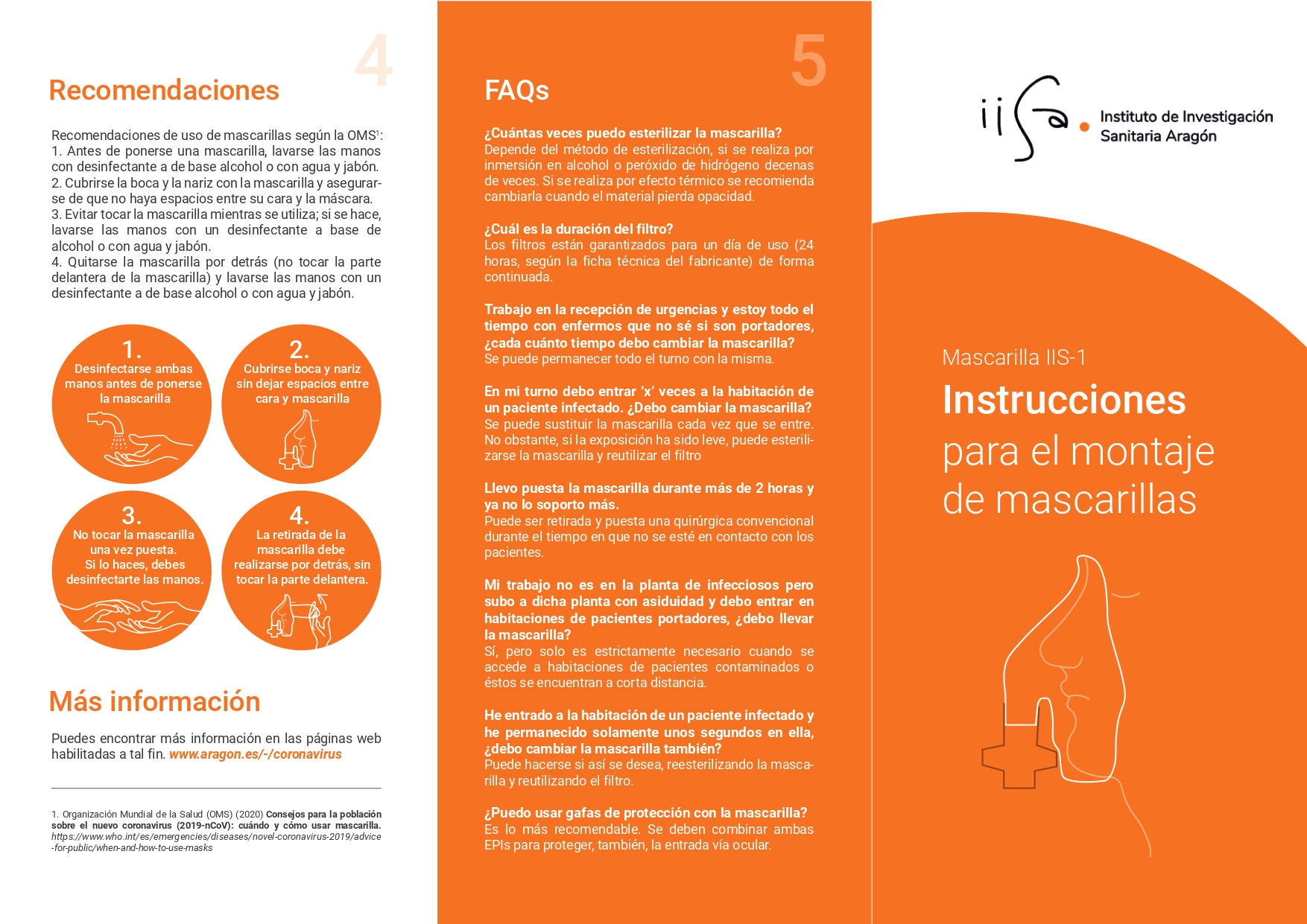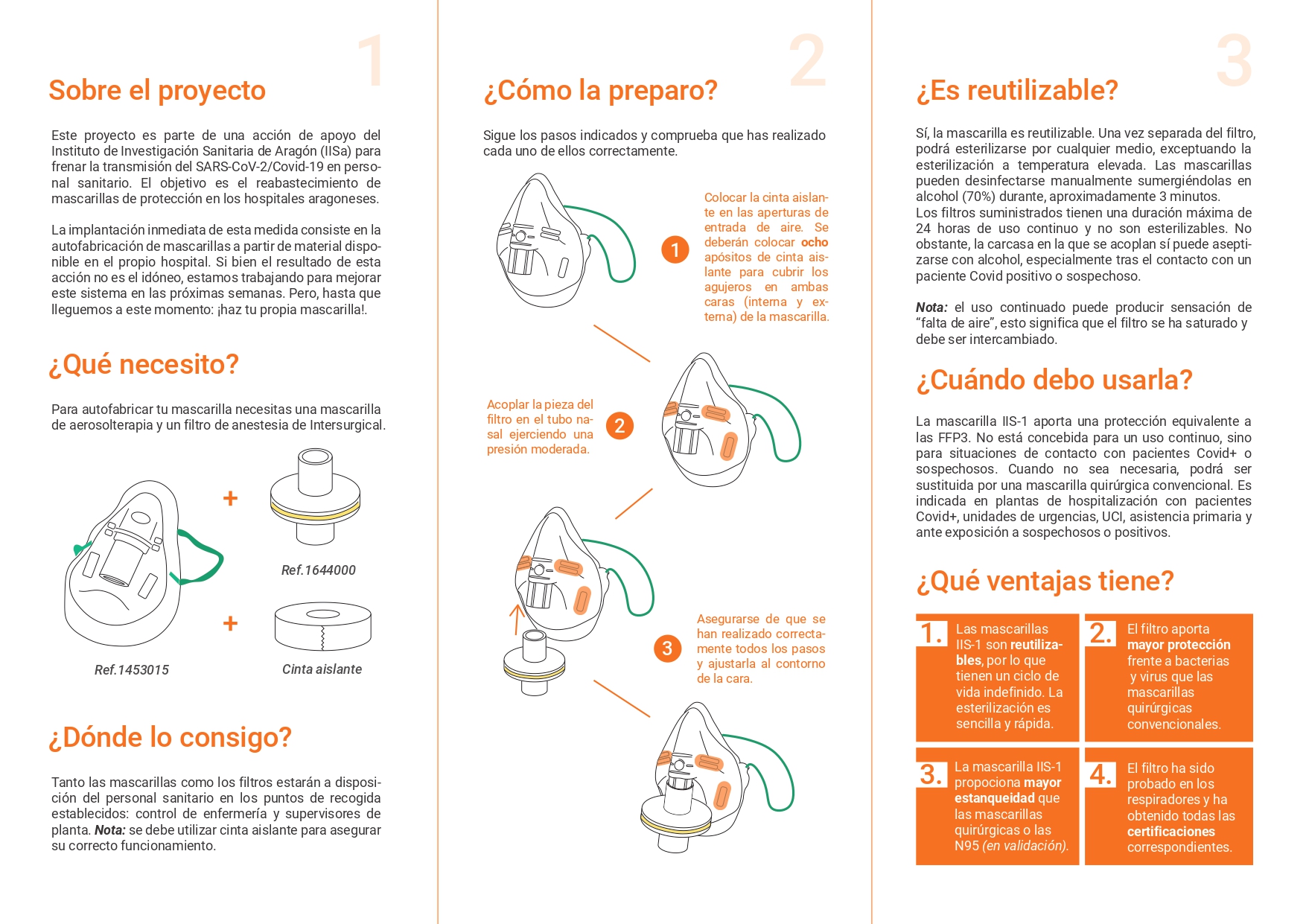 Este proyecto es parte de una acción de apoyo del Instituto de Investigación Sanitaria de Aragón (IIS Aragón) para frenar la transmisión del SARS-CoV-2/Covid-19 en personal sanitario. El objetivo es el reabastecimiento de mascarillas de protección en los hospitales aragoneses. La falta de mascarillas, en número y calidad, es actualmente uno de los problemas más acuciantes del personal sanitario que atiende a pacientes Covid-19 positivos. Con el objetivo de abastecer a los hospitales de EPIs seguros ante la exposición al SARS-CoV-2, se propone desarrollar mascarillas que filtren el aire, seguras, fácilmente esterilizables y reutilizables. Para el abordaje del proyecto, se propone un desarrollo en dos líneas, pudiendo desarrollar una tercera en función del avance de la situación global. En una primera línea, se proponen las mascarillas IIS-1, que consisten en la adaptación de mascarillas de aerosolterapia mediante el acoplamiento de un filtro de uso habitual en respiradores. Este sistema va acompañado de un sistema de esterilización basado en una sumersión en etanol (alcohol 70%). El uso de productos ya certificados (mascarilla de aerosolterapia y filtro) supone una implantación inmediata y a bajo coste para afrontar el desabastecimiento de esta tipología de EPIs en los hospitales. En paralelo, se trabaja en una segunda línea donde, a corto plazo, se propone la introducción de las mascarillas IIS-2 donde está previsto integrar mejoras progresivas para dotar al personal sanitario de mascarillas eficientes y seguras de forma permanente. Para ello, actualmente estamos trabajando en la fabricación de adaptadores y nuevos filtros de alta eficiencia de filtrado.