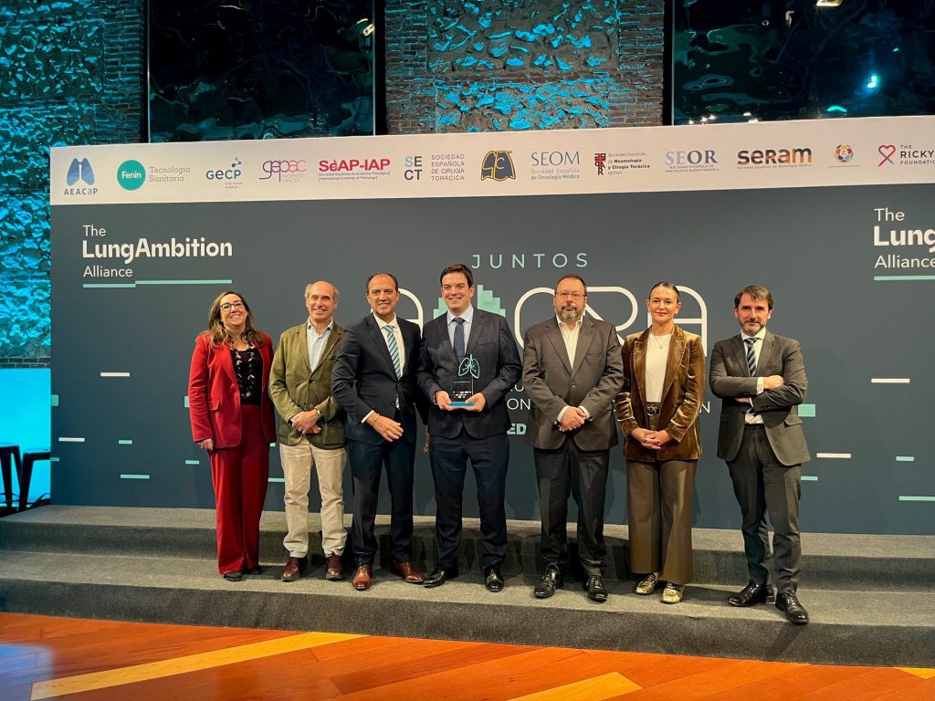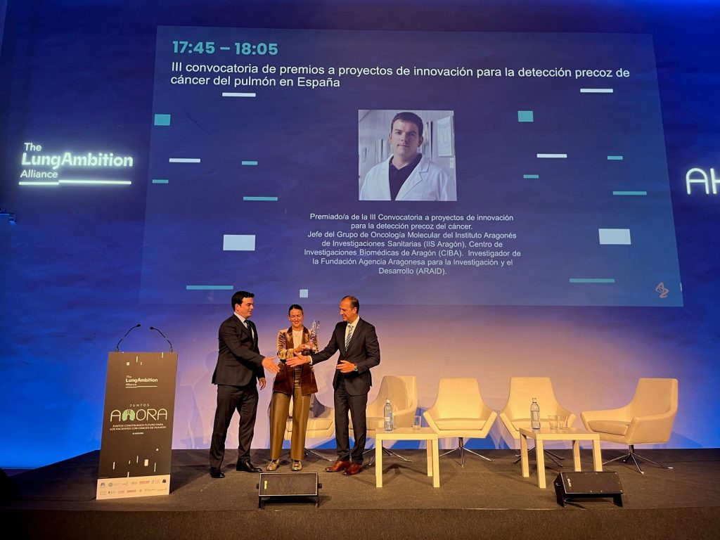Precisamente, este galardón fue entregado ayer por la tarde en el marco del tercer encuentro Juntos Ahora de Lung Ambition Alliance en la Fundación Real Fábrica de Tapices de Madrid. Alberto J. Schuhmacher estuvo acompañado por el consejero de Sanidad del Gobierno de Aragón, José Luis Bancalero; Ángel Lanas, director científico IIS Aragón; Óscar López, director ejecutivo IIS Aragón y Eva López, coordinadora de la Unidad de Investigación Clínica.