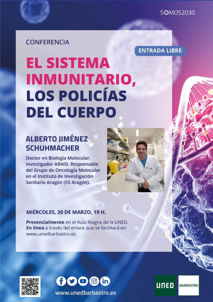 El doctor en Biología Molecular, Investigador ARAID y Responsable del Grupo de Oncología Molecular en el Instituto de Investigación Sanitaria Aragón (IIS Aragón), Alberto Jiménez Schuhmacher, pronunciará una conferencia sobre el tema “El sistema inmunitario, los policías del cuerpo”, este miércoles en el Aula Magna de la UNED de Barbastro, José Luis López Aranguren, a las 19:00 horas, con entrada libre.