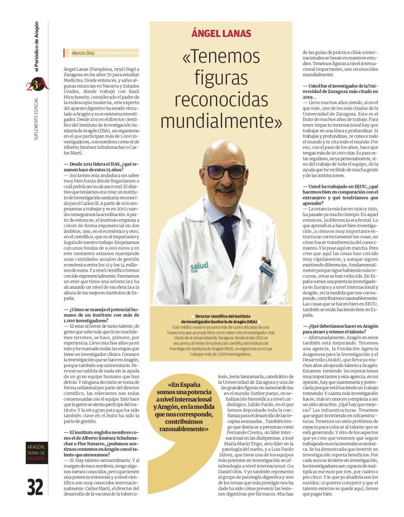 25 abril, 2024El Periódico de Aragón publicó el 23 de abril, en su edición digital y de papel, un suplemento que demuestra el gran talento de Aragón. Entre los perfiles entrevistados, Ángel Lanas, director científico del Instituto de Investigación Sanitaria Aragón. Una amplia conversación para visibilizar la labor, trayectoria y personas que formar parte de este Instituto