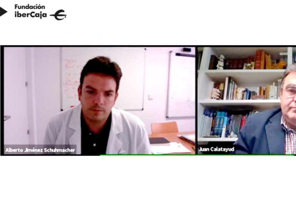 "Si no tenemos la unión de investigadores y clínicos iremos mucho más despacio en los avances sanitarios". Esa es una de las principales conclusiones de la videoconferencia de la Fundación Ibercaja que han protagonizado este jueves, Alberto Jiménez Schuhmacher, investigador y jefe del grupo de Oncología Molecular del Instituto de Investigación Sanitaria de Aragón (ISS), y Juan Calatayud, neurocirujano, jefe de servicio del hospital Clínico Lozano Blesa y coordinador del grupo de investigación asociado al IIS. Así, Jiménez Schuhmacher ha señalado que "la investigación de hoy es la medicina de mañana, pero la investigación biomédica de mañana necesita dialogar con la medicina de hoy". "Desde que empiezo a tener más interacción con los clínicos, cómo han cambiado las líneas de investigación", ha añadido. Ambos han defendido la necesidad de grupos multidisciplinares.