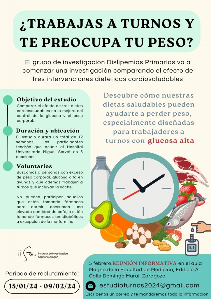 Diversos estudios han demostrado que los trabajadores por turnos presentan mayores riesgos de presentar enfermades metabólicas, así como sobrepeso y obesidad. Sin embargo, los estudios realizados hasta la fecha con esta población son escasos, con bajo número de participantes un tiempo limitado. Por ello, el grupo de Dislipemias Primarias del IIS Aragón arranca un estudio de intervención nutricional con el objetivo principal de explorar el efecto de tres diferentes intervenciones dietéticas en personas que tengan un trabajo a turnos y presenten sobrepeso u obesidad y prediabetes o DM2, durante 12 semanas.
