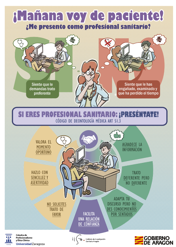 Además, el grupo FEPS ha elaborado un documento gráfico divulgativo titulado “¡Mañana voy de paciente! ¿Me presento como profesional sanitario?”, fruto del proyecto «Enfermar es humano: cuando el paciente es el médico». Este material actúa como una suerte de “manual de estilo” visual sobre cómo presentarse como médico cuando se acude como paciente, en línea con la recomendación recogida en el artículo 51.3 del nuevo Código de Deontología Médica.