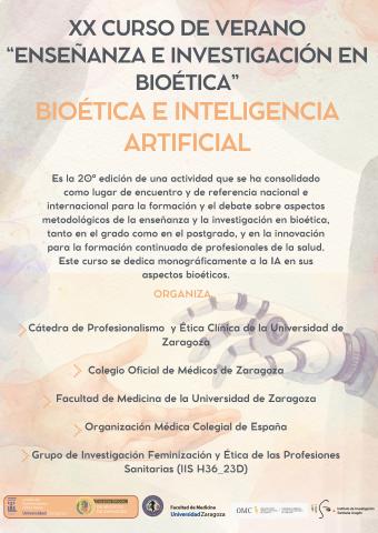Por un lado, el grupo ha participado activamente en la organización del «XX Curso de Verano Enseñanza e investigación en Bioética. Bioética e Inteligencia Artificial«, que que se celebrará los días 5 y 6 de septiembre en el Centro de Formación del Colegio de Médicos de Zaragoza (C/ Ana Isabel Herrero 3 y 5). Se trata de la 20ª edición de una actividad que se ha consolidado como lugar de encuentro y de referencia nacional e internacional para la formación y el debate sobre aspectos metodológicos de la enseñanza y la investigación en bioética, tanto en el grado como en el postgrado, y en la innovación para la formación continuada de profesionales de la salud.