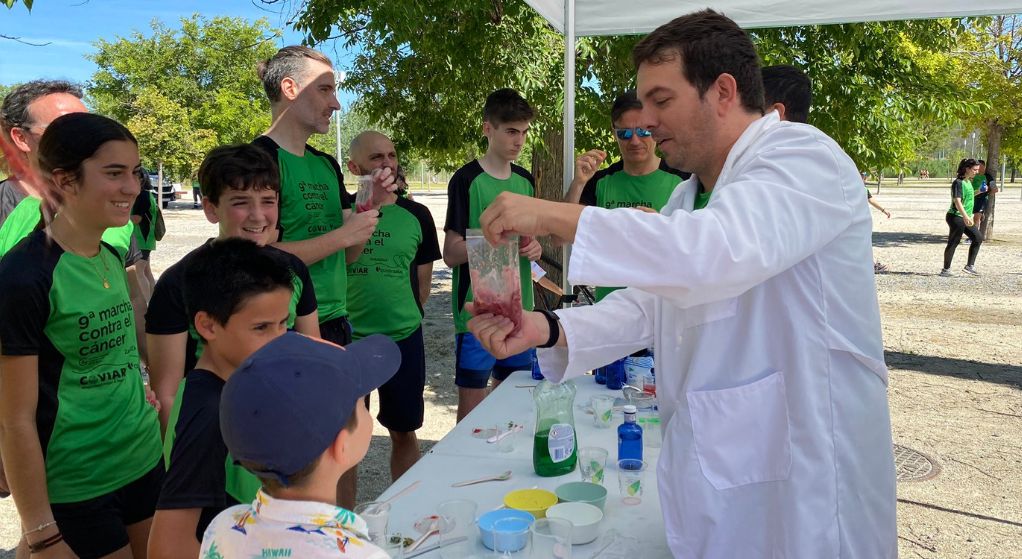 El parque del Agua de Zaragoza se tiñó ayer de verde esperanza con la presencia de 2.400 personas en la 9ª Marcha Contra el Cáncer, organizada por la Asociación Española Contra el Cáncer en Zaragoza. El IIS Aragón participó en equipo, con veinte de sus miembros sumándose al evento para apoyar la lucha de la AECC. Tras la carrera de 5 km, los asistentes disfrutaron de talleres de hábitos de vida saludables, juegos y actividades científicas. En estas últimas, participaron Alberto Jiménez Schuhmacher y David Fernández Antorán, investigadores del IIS Aragón. Invitaban a los más curiosos a extraer el ADN de unas fresas.