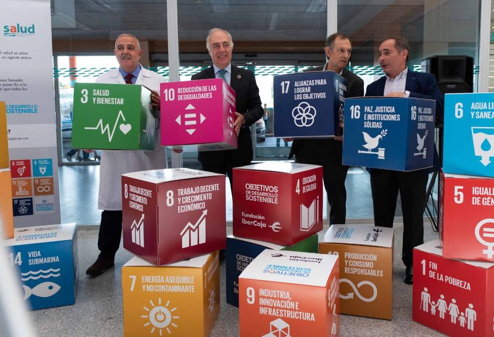 El Miguel Servet, la Fundación Ibercaja y la Fundación Ecología y Desarrollo (Ecodes) se han unido precisamente para iniciar una campaña de visibilización de estos objetivos. Una de las primeras acciones emprendidas para ello es la inauguración, en el vestíbulo de Traumatología del hospital, de una exposición, en la que se muestran 17 cubos tridimensionales, cada uno de los cuales representa uno de los objetivos de la Agenda 2030. Entre otras ideas, recogen el fin de la pobreza, salud para todos, la igualdad de género, energía asequible...