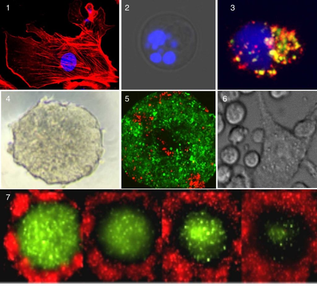 1. Célula de sarcoma teñida con colorantes fluorscentes para el citoesqueleto (rojo) y el núcleo (azul). 2. Célula de sarcoma muerta por la acción de linfocitos T citotóxicos anti-tumorales. 3. Imagen de un linfocito T citotóxico anti-tumoral. 4. Imagen tridimensional de un tumor de cancer colorectal humano (Esferoide) reconstruido en el laboratorio. 5. Imagen de un tumor de cancer colorectal (teñido en verde) infiltrado por células Asesinas Naturales (NK) (teñidas en rojo). 6. Detalle en gran aumento de células NK intentando eliminar una célula de cancer colorectal humano. 7. Imagen de células NK (teñidas en rojo) eliminando el tumor de cancer colorectal teñido en verde.