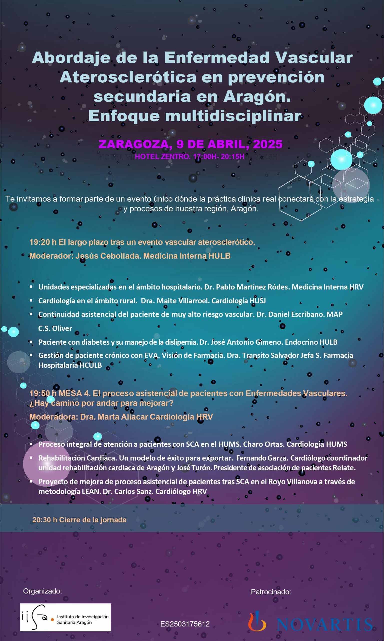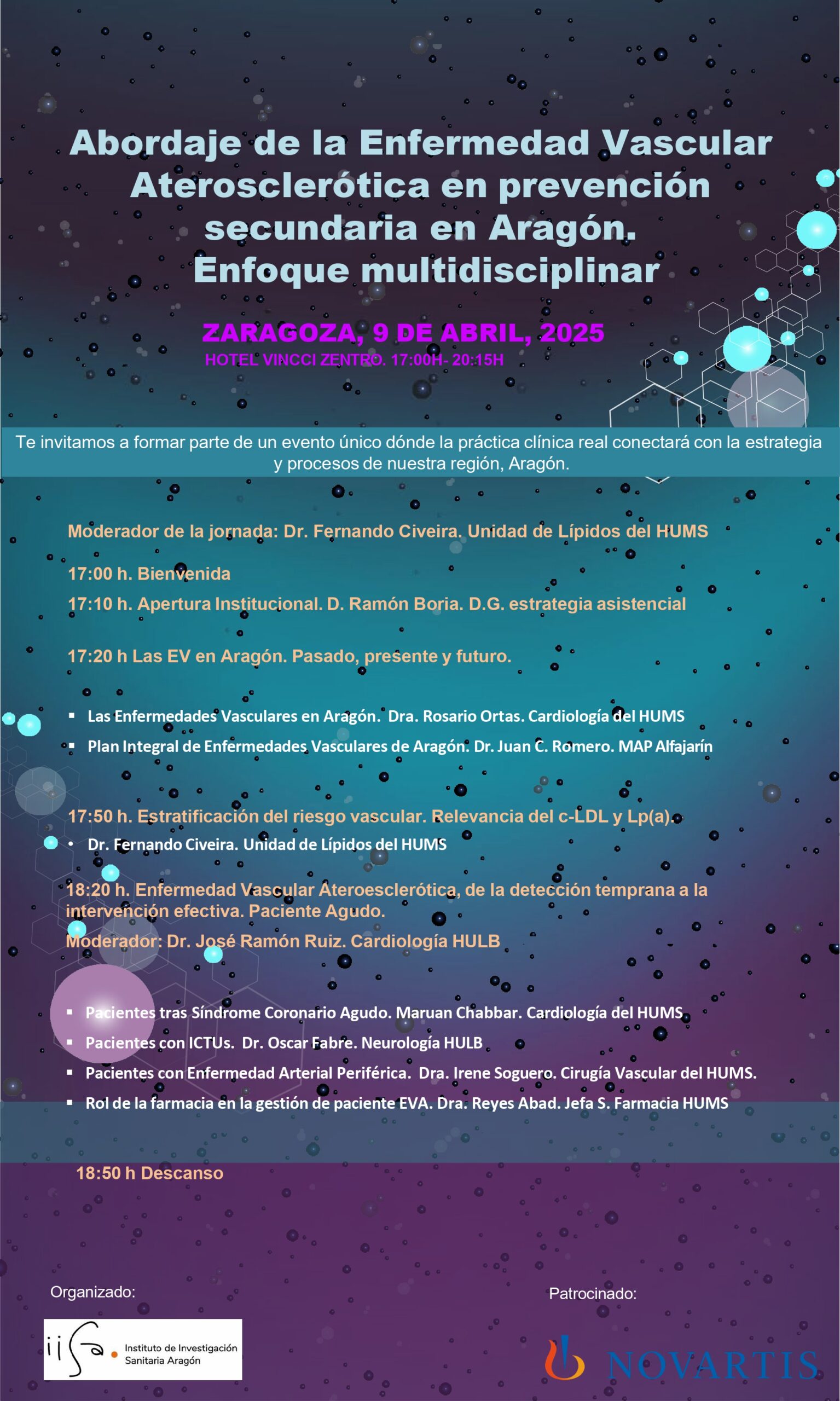 Desde el Instituto de Investigación Sanitaria de Aragón (IIS Aragón) te invitamos a asistir a la jornada «Abordaje de la Enfermedad Vascular Aterosclerótica en prevención secundaria en Aragón. Enfoque multidisciplinar», que tendrá lugar el 9 de abril de 2025. Puedes consultar el programa de la jornada a continuación: