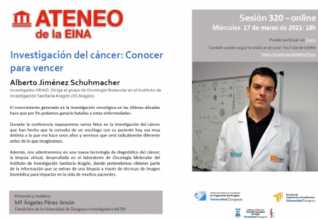El investigador ARAID y responsable del grupo de Oncología Molecular en el Instituto de Investigación Sanitaria Aragón (IIS Aragón), Alberto Jiménez Schuhmacher, participará en la próxima sesión del Ateneo de la EINA, donde impartirá la conferencia «Investigación del cáncer: conocer para vencer» .