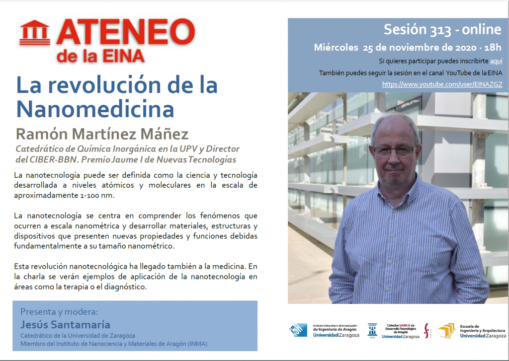 La sesión estará protagonizada por el director científico del Centro de Investigación Biomédica en Red en Bioingeniería, Biomateriales y Nanomedicina (CIBER-BBN), Ramón Martínez Máñez, y será presentada y moderada por Jesús Santamaría, catedrático de la Universidad de Zaragoza y miembro del Instituto de Nanociencia y Materiales de Aragón (INMA).