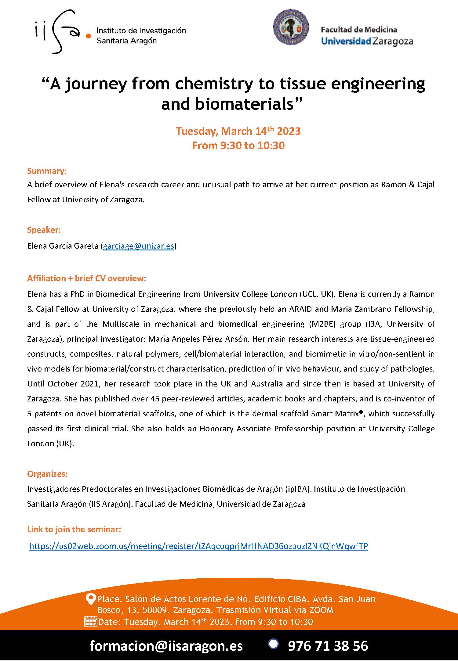 Biomedical Seminar “A journey from chemistry to tissue engineering and biomaterials” Tuesday, March 14th 2023 From 9:30 to 10:30
