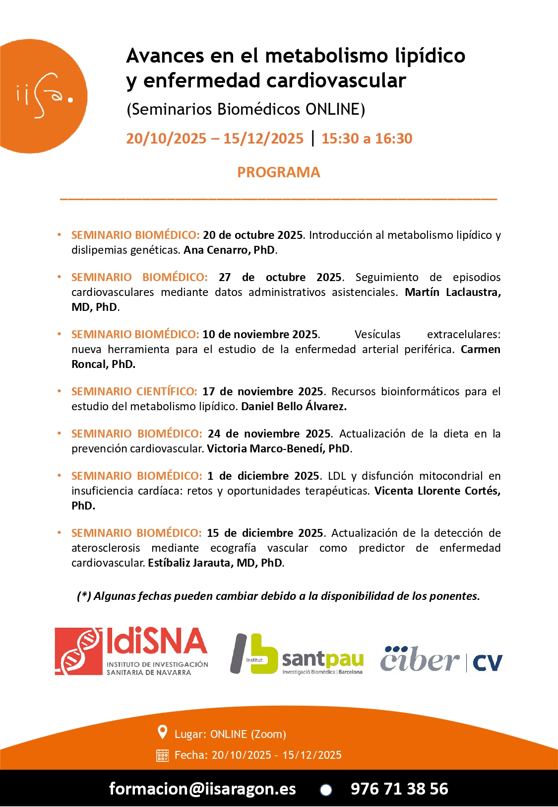 CICLO DE SEMINARIOS BIOMÉDICOS ONLINE: Avances en el metabolismo lipídico y enfermedad cardiovascular