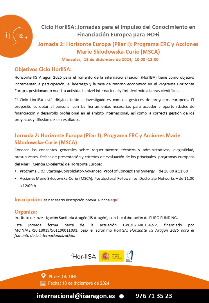 Organizada por Instituto de Investigación Sanitaria Aragón(IIS Aragón), con la colaboración de EURO FUNDING. Esta jornada forma parte de la actuación GPE2023-001342-P, financiado por MCIN/AEI/10.13039/501100011033, bajo el acrónimo HorIISA: Horizonte IIS Aragón 2025 para el fomento de la internacionalización.