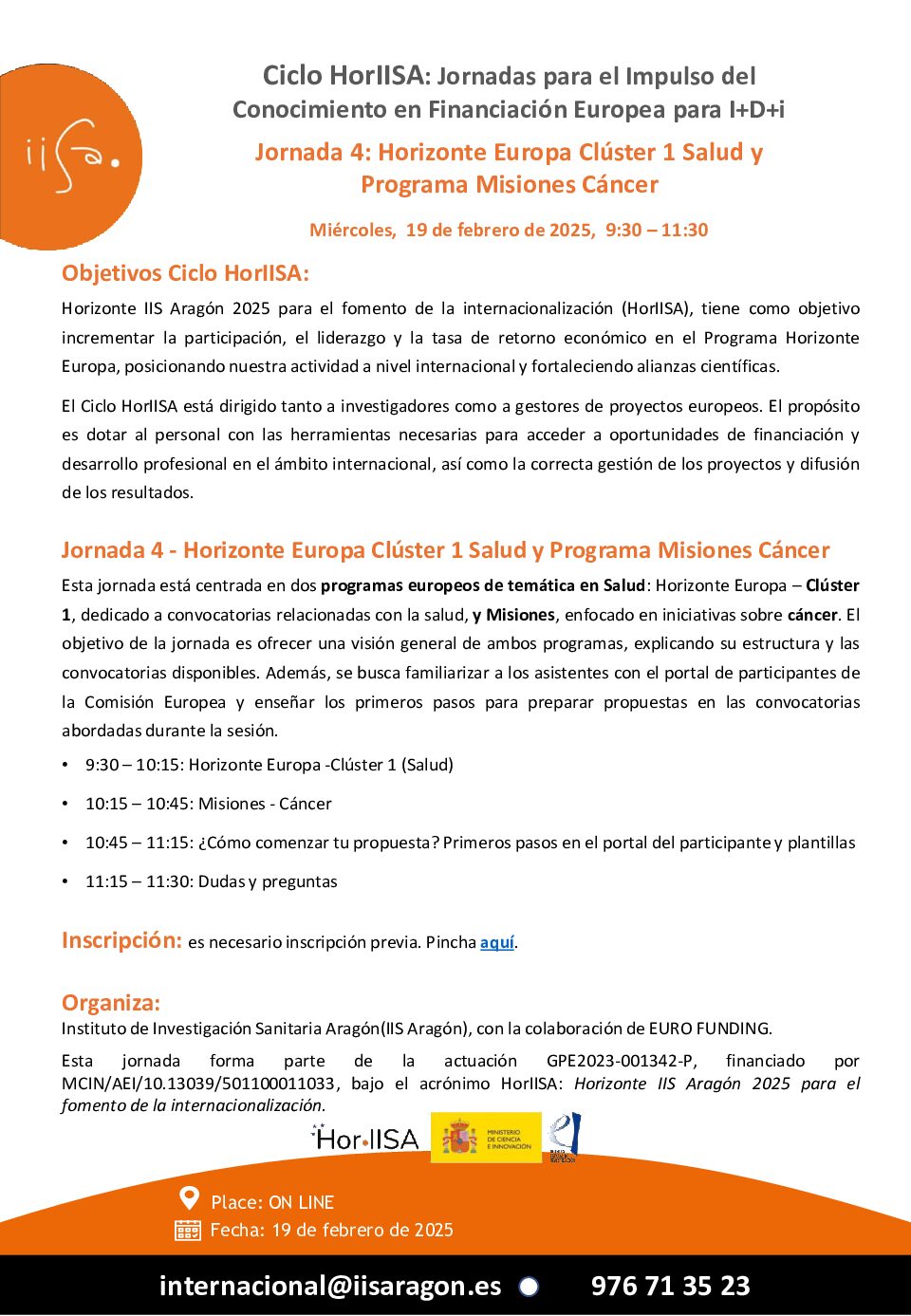 Organizada por Instituto de Investigación Sanitaria Aragón(IIS Aragón), con la colaboración de EURO FUNDING. Esta jornada forma parte de la actuación GPE2023-001342-P, financiado por MCIN/AEI/10.13039/501100011033, bajo el acrónimo HorIISA: Horizonte IIS Aragón 2025 para el fomento de la internacionalización.