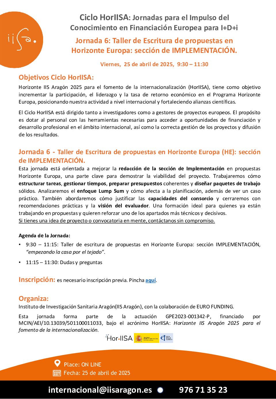 Organizada por Instituto de Investigación Sanitaria Aragón(IIS Aragón), con la colaboración de EURO FUNDING. Esta jornada forma parte de la actuación GPE2023-001342-P, financiado por MCIN/AEI/10.13039/501100011033, bajo el acrónimo HorIISA: Horizonte IIS Aragón 2025 para el fomento de la internacionalización.