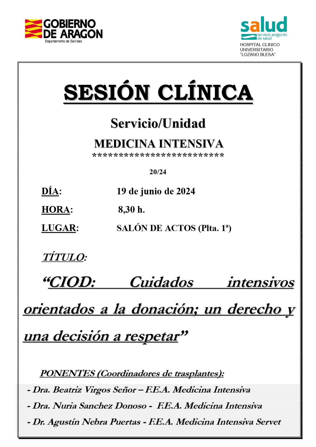 Sesión clínica que tendrá lugar el 19 de junio de 2024 a las 8:30 h. (Salón de actos del Hospital Clínico Universitario Lozano Blesa, 1ª planta).