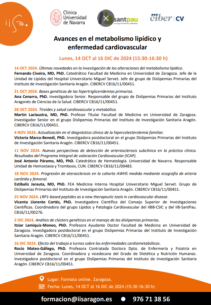 Curso: Avances en el metabolismo lipídico y enfermedad cardiovascular (ONLINE) (14 OCT-16 DIC)