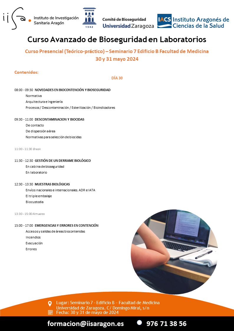 El Instituto de Investigación Sanitaria Aragón, en coordinación con el Comité de Bioseguridad de la Universidad de Zaragoza y el Instituto Aragonés de Ciencias de la Salud, lanzan el Curso Avanzado de Bioseguridad en Laboratorios, que tendrá lugar el 30 y 31 de mayo de 2024 en el Seminario 7 (Facultad de Medicina, Edificio B).