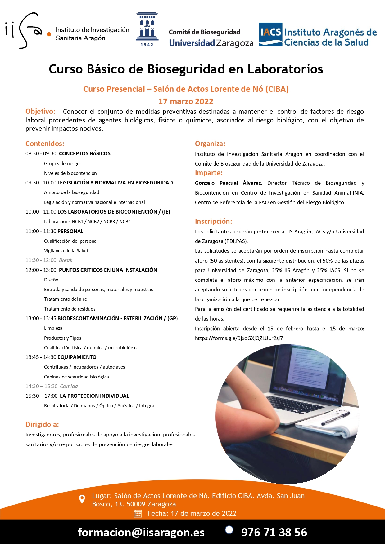 El Instituto de Investigación Sanitaria Aragón en coordinación con el Comité de Bioseguridad de la Universidad de Zaragoza organizan el 17 de marzo de 2022 el Curso Básico «Bioseguridad en Laboratorios».