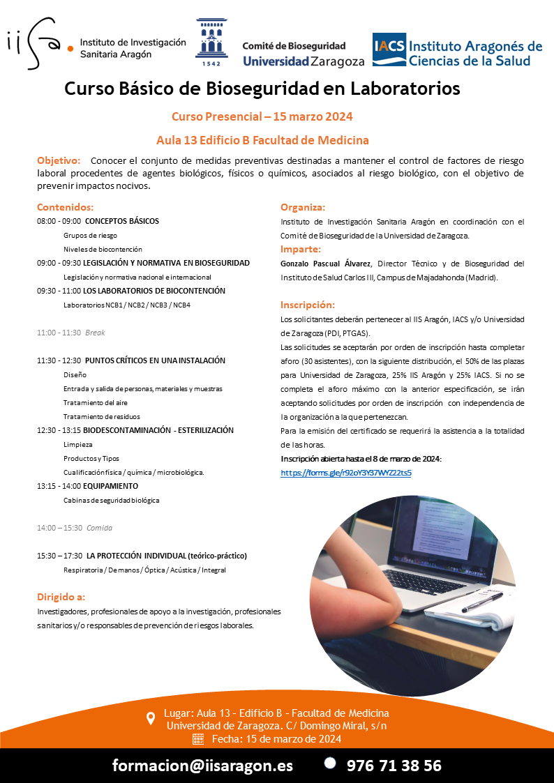 El Instituto de Investigación Sanitaria Aragón en colaboración con el Instituto Aragonés de Ciencias de la Salud y el Comité de Bioseguridad de la Universidad de Zaragoza organizan el Curso Básico de Bioseguridad en Laboratorios. El curso tendrá lugar el 15 de marzo de 2024, en formato presencial en la Facultad de Medicina de la Universidad de Zaragoza.