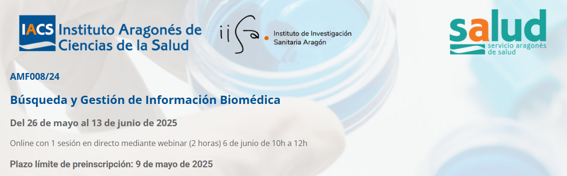 Te invitamos a inscribirte al Curso: Búsqueda y Gestión de Información Biomédica, organizado por el Instituto Aragonés de Ciencias de la Salud (IACS), que tendrá lugar del 26 de mayo al 13 de junio de 2025 y que se celebrará en modalidad mixta.