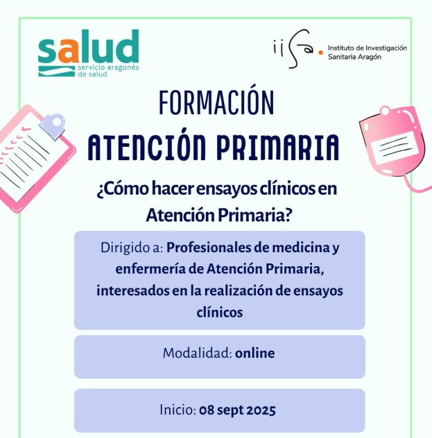 Te invitamos a participar en el Curso ¿Cómo hacer ensayos clínicos en atención primaria? organizado por el Instituto de Investigación Sanitaria Aragón (IIS Aragón), que tendrá lugar el 8 de septiembre de 2025 y que se celebrará ONLINE.