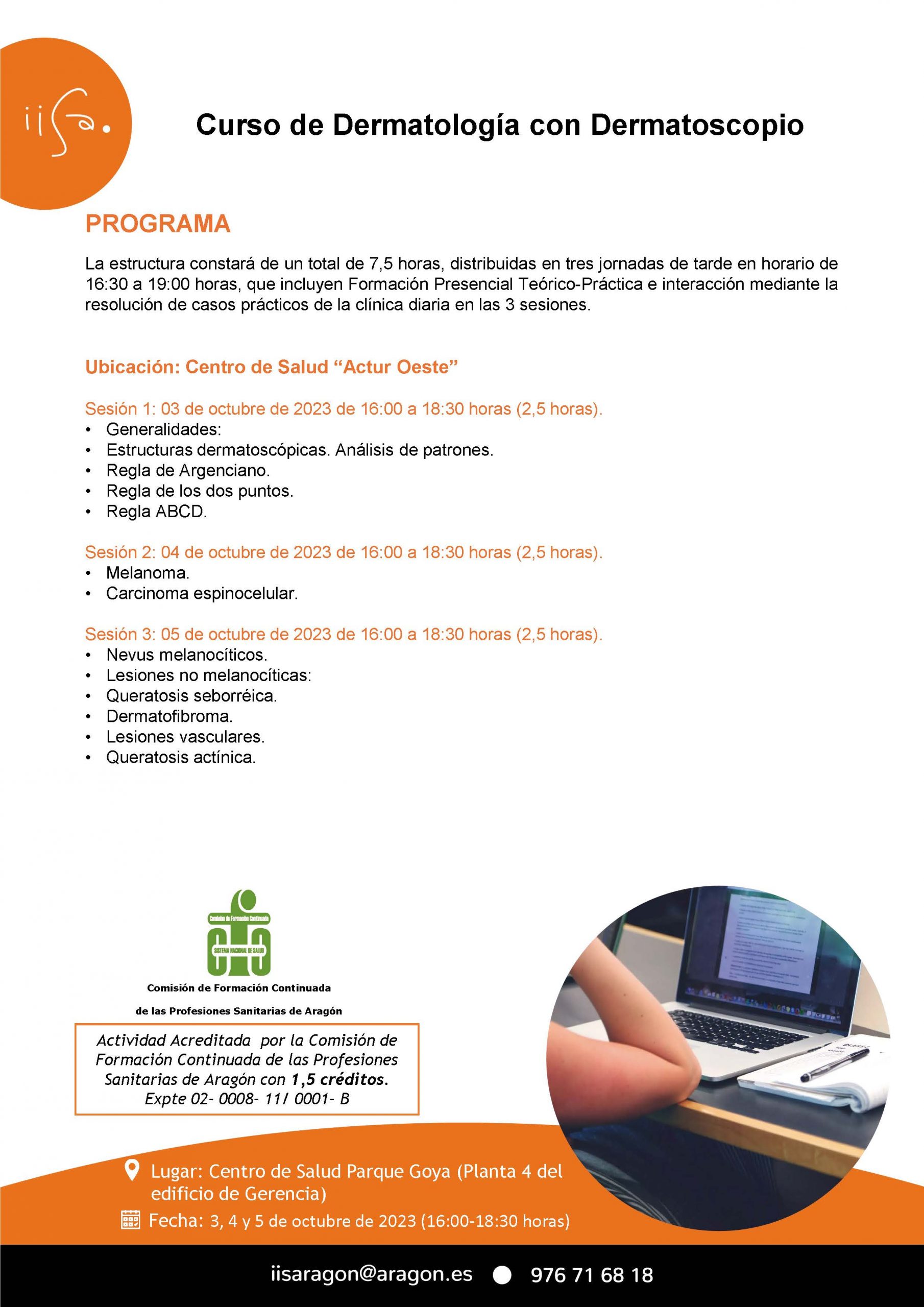 El Instituto de Investigación Sanitaria Aragón en colaboración con el Servicio de Dermatología HRV organizan del 3 al 5 de de 2023 de 16:00 a 18:30 horas el Curso de «Dermatología con Dermatoscopio»