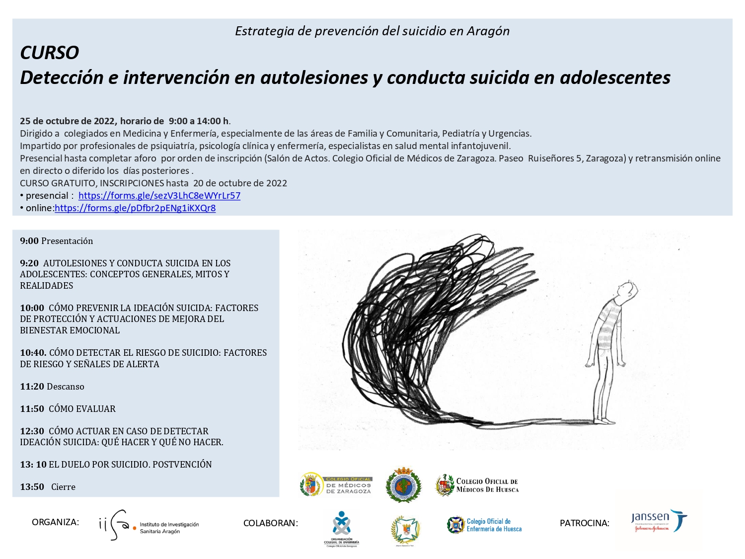 El curso tendrá lugar en horario de 09:00 a 14:00 en el Salón de Actos del Colegio Oficial de Médicos de Zaragoza (Paseo Ruiseñores 5, Zaragoza). Estará dirigido a Dirigido a colegiados en Medicina y Enfermería, especialmente de las áreas de Familia y Comunitaria, Pediatría y Urgencias, y será impartido por profesionales de psiquiatría, psicología clínica y enfermería, especialistas en salud mental infantojuvenil.