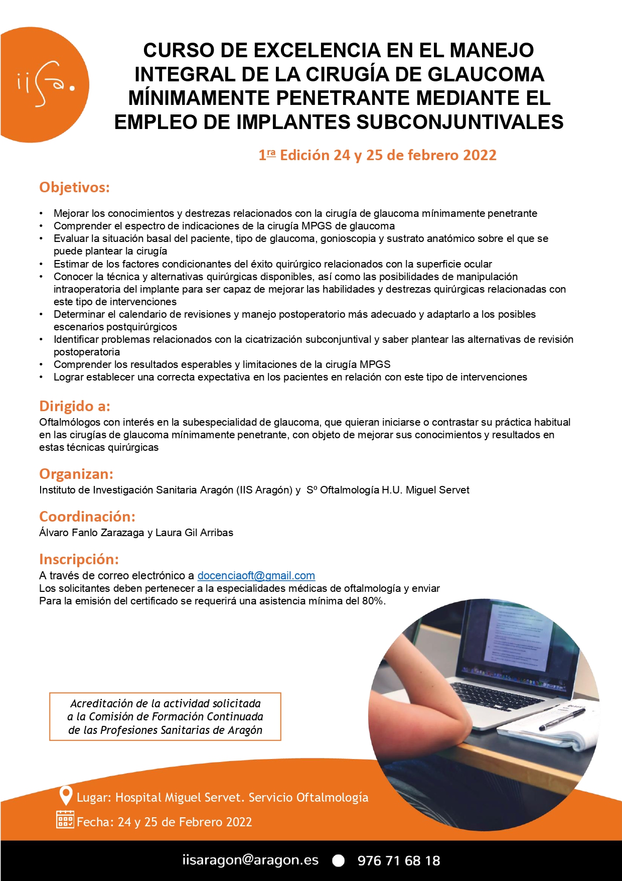 El Instituto de Investigación Sanitaría Aragón organiza el 24 y 25 de febrero 2022 el Curso Excelencia en el manejo integral de la cirugía de glaucoma mínimamente penetrante mediante el empleo de implantes subconjuntivales.