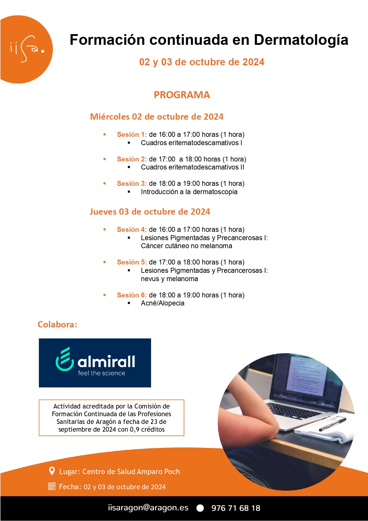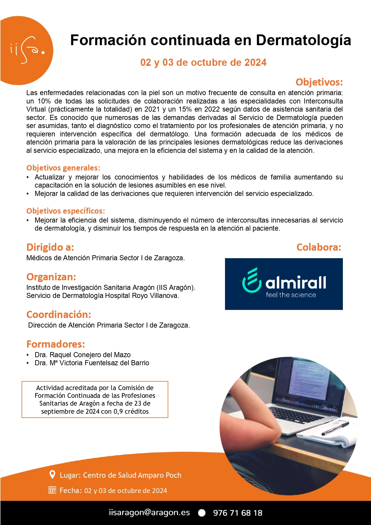El Instituto de Investigación Sanitaria Aragón y el Servicio de Dermatología Hospital Royo Villanova lanzan el Curso «Formación continuada en Dermatología», que tendrá lugar el 02 y 03 de octubre de 2024 en el Centro de Salud Amparo Poch (C/ de Emilia Pardo Bazán, s/n, 50018 Zaragoza).