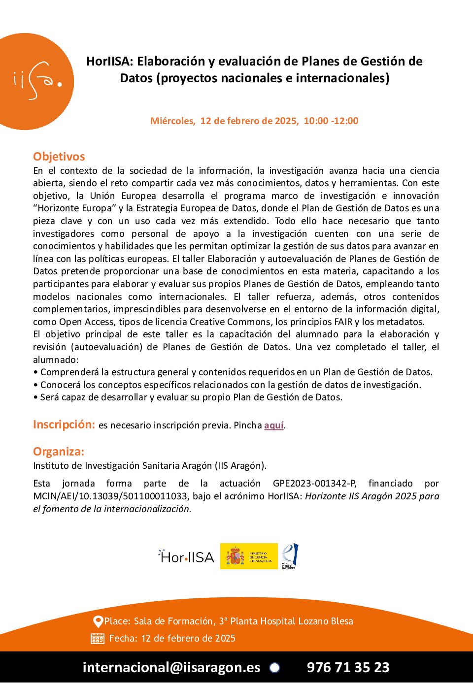 El Miércoles, 12 de febrero de 2025, a las 10:00 el Instituto de Investigación Sanitaria Aragón os invita al Curso HorIISA: Elaboración y evaluación de Planes de Gestión de Datos (proyectos nacionales e internacionales).