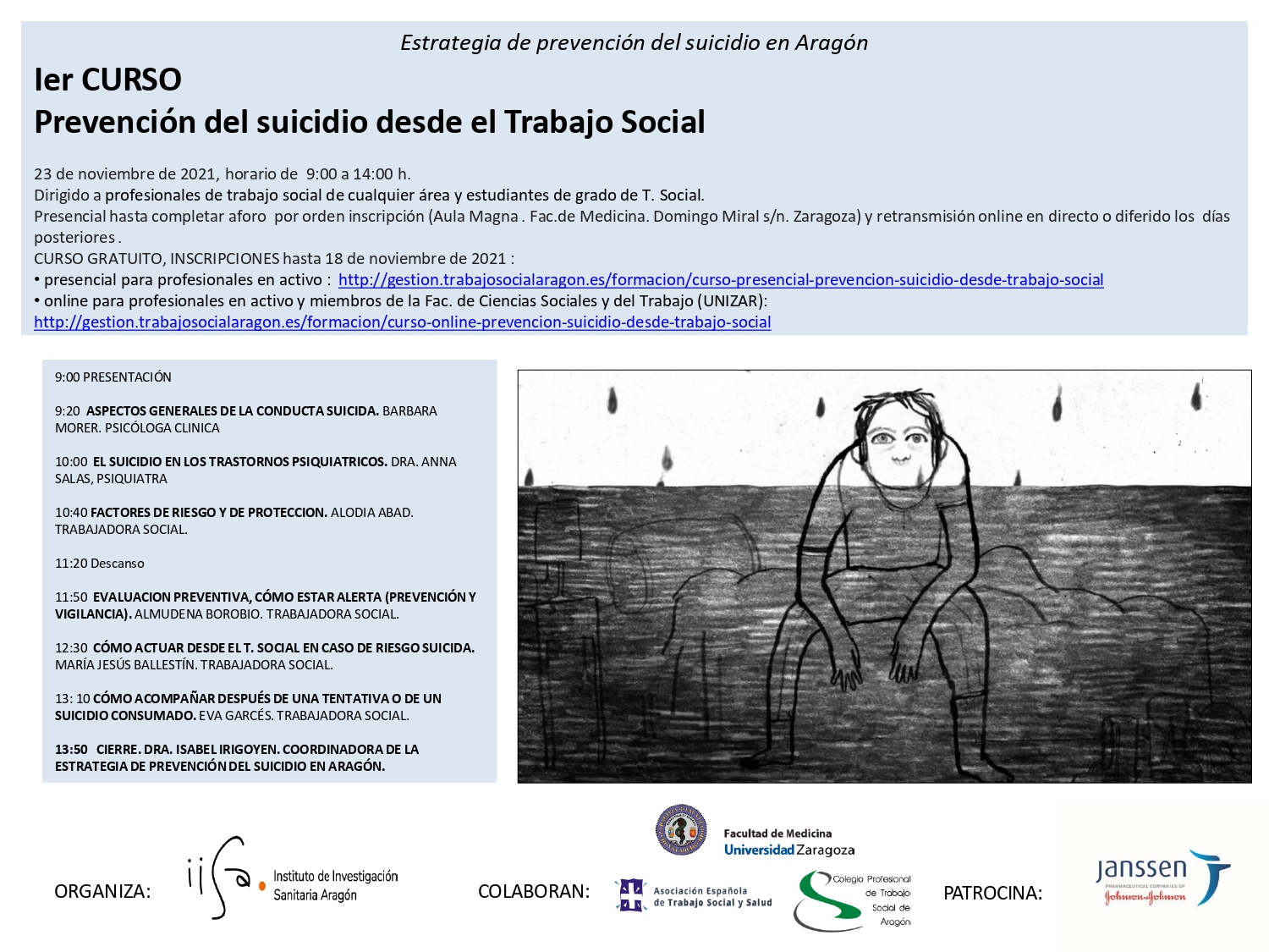 El Instituto de Investigación Sanitaria Aragón (IIS Aragón) en colaboración con la Asociación Española de Trabajo Social y Salud y el Colegio profesional de Trabajo Social de Aragón organizan el 23 de noviembre el Curso «Prevención del suicidio desde el Trabajo Social».