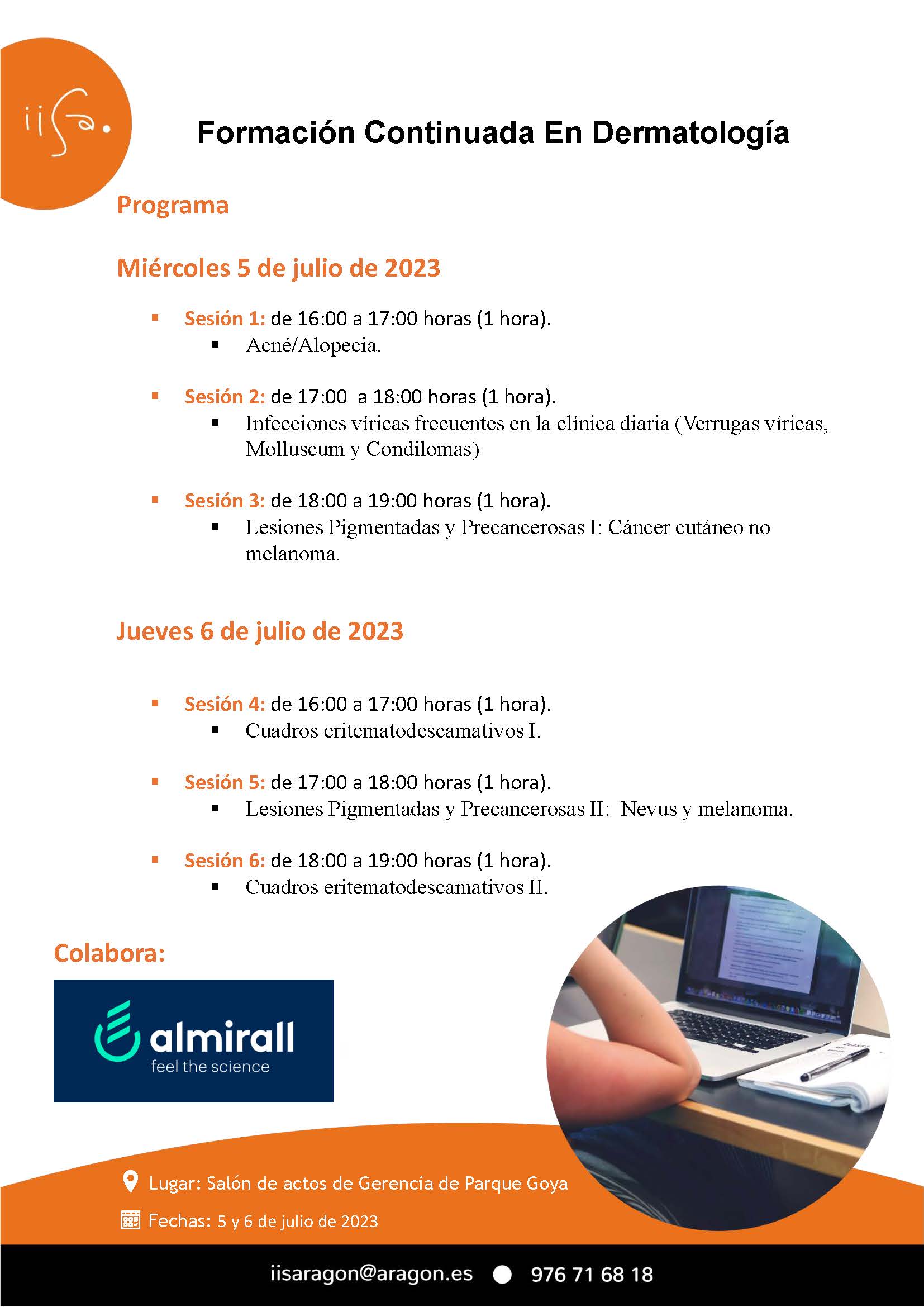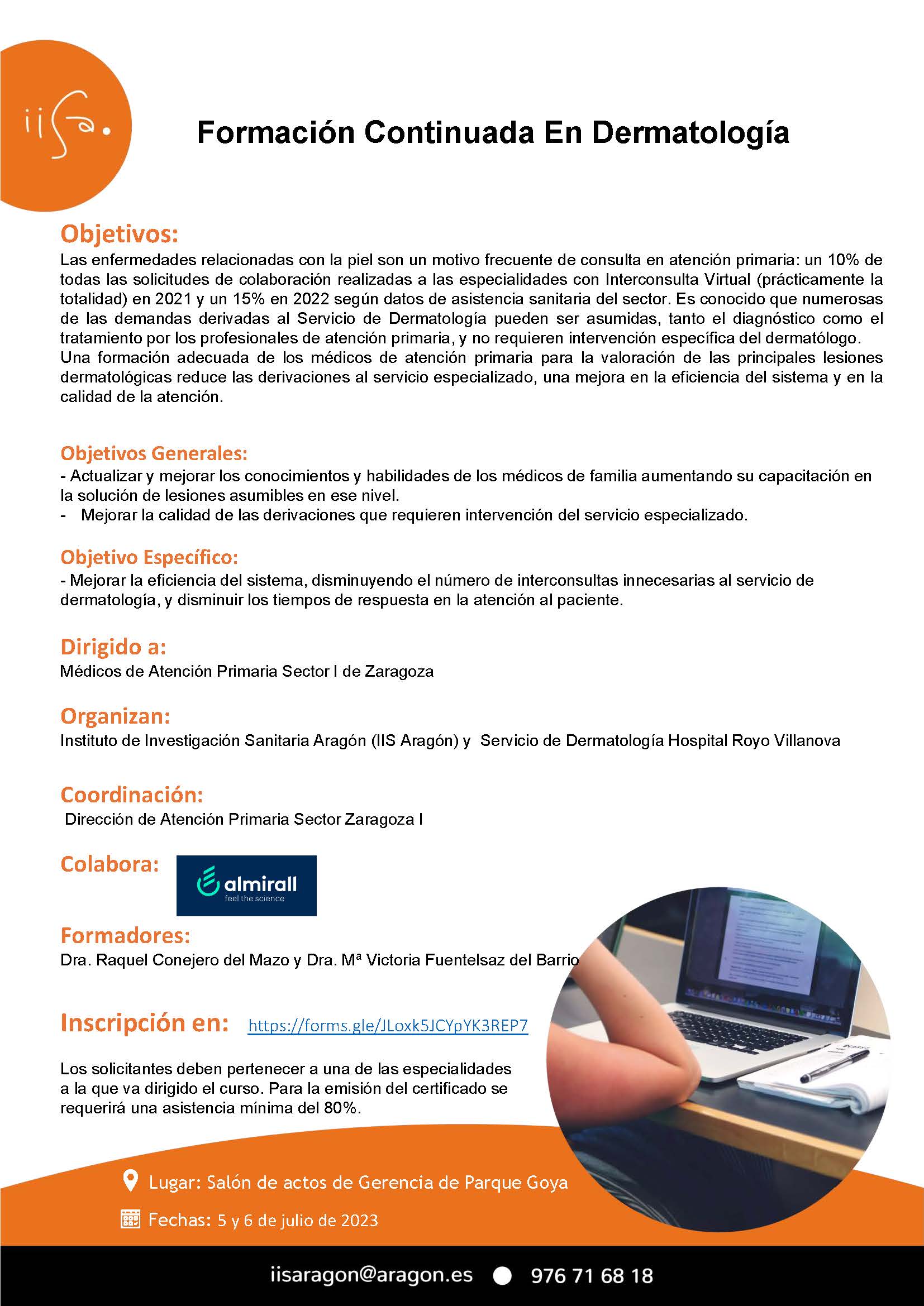 El Instituto de Investigación Sanitaria Aragón en colaboración con el Servicio de Dermatología Hospital Royo Villanova organizan los días 5 y 6 de julio de 2023 la Formación Continuada En Dermatología.