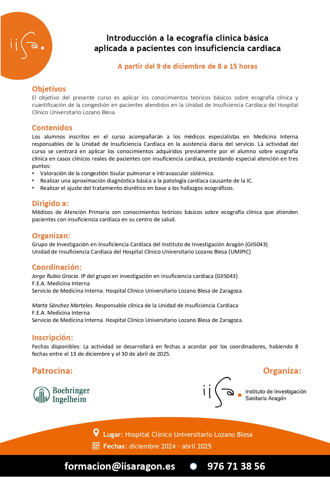 El objetivo de este curso es la aplicación de los conocimientos teóricos básicos sobre ecografía clínica y cuantificación de la congestión en pacientes atendidos en la Unidad de Insuficiencia Cardíaca del Hospital Clínico Universitario Lozano Blesa. Se lanzará un anuncio, con su correspondiente enlace de inscripción, para cada una de las sesiones.