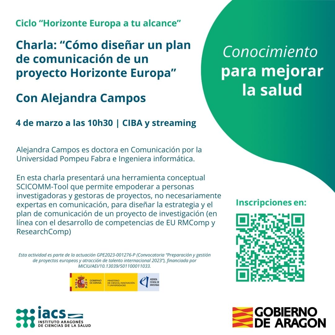 Desde la Oficina de Proyectos del Instituto Aragonés de Ciencias de la Salud, se organiza el seminario del ciclo “Horizonte Europa a tu alcance”: “Cómo diseñar un plan de comunicación de un proyecto Horizonte Europa”
