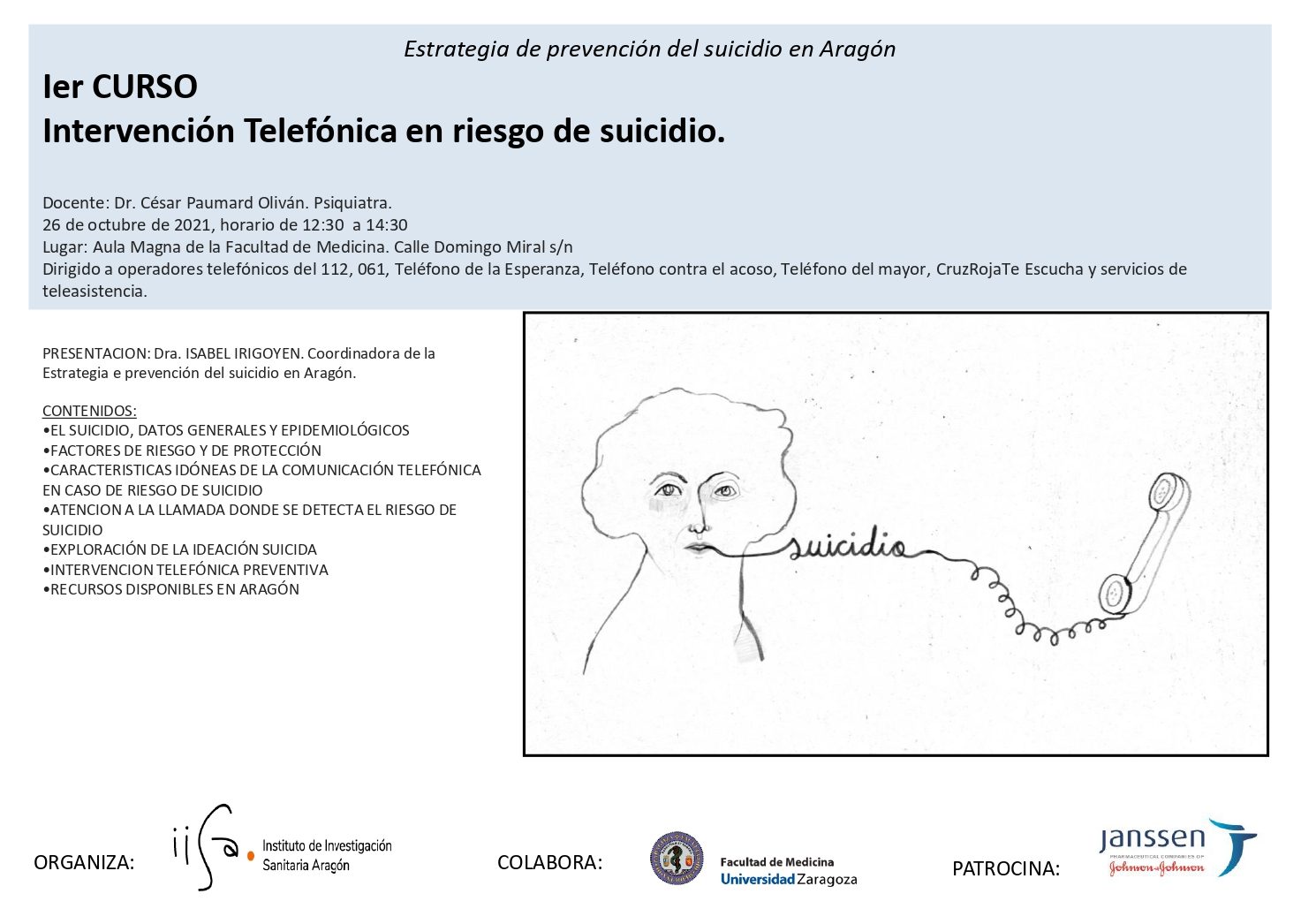 En el marco de la Estrategia de Prevención del Suicidio en Aragón cuya responsable es la dra. Isabel Irigoyen, el próximo 26 de octubre tendrá lugar el «I Curso de Intervención Telefónica en riesgo de suicidio», en horario de 12:30 a 14:30. El docente del curso será el dr. César Paumard Oliván (Psiquiatra).
