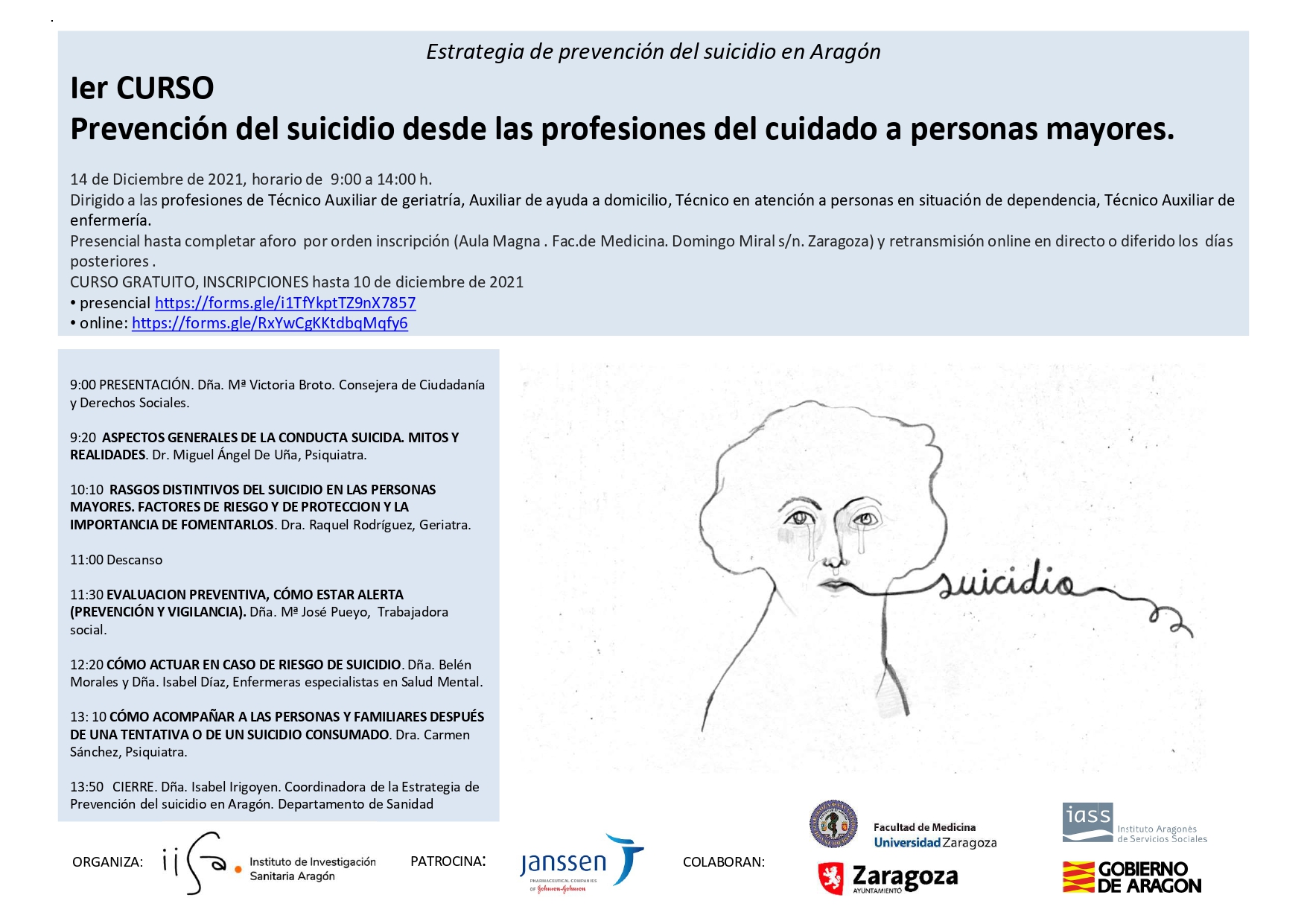 La formación ha sido organizada desde el Gobierno de Aragón por el Instituto de Investigación Sanitaria Aragón con la colaboración del Instituto Aragonés de Servicios Sociales, el Ayuntamiento de Zaragoza y la Facultad de Medicina de la Universidad de Zaragoza y el patrocinio de Janssen. Se ofrece de forma gratuita a todos los profesionales que realizan tareas de cuidado a personas mayores posibilitando que, en el marco de la relación que establecen, puedan actuar eficazmente en la lucha contra estas trágicas muertes, dado que las personas de estos grupos de edad son las que tienen porcentualmente el mayor riesgo de suicidio.