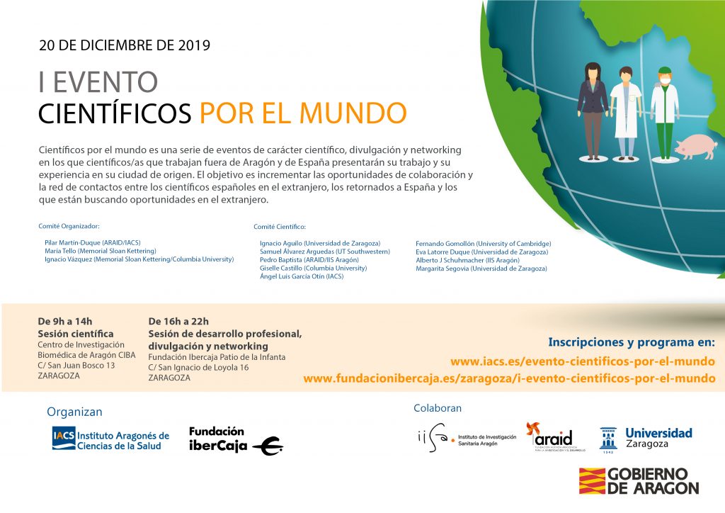Científicos por el mundo es una serie de eventos de carácter científico, divulgación y networking en los que científicos/as que trabajan fuera de Aragón y de España presentarán su trabajo y su experiencia en su ciudad de origen. El objetivo es incrementar las oportunidades de colaboración y la red de contactos entre los científicos españoles en el extranjero, los retornados a España y los que están buscando oportunidades en el extranjero.
