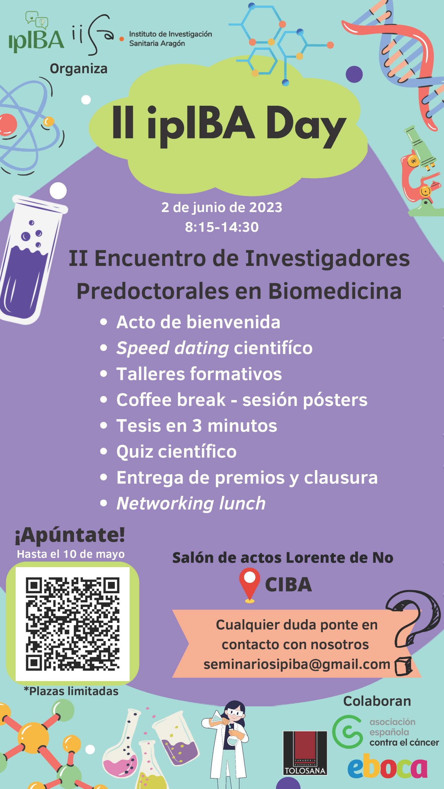 Todos los investigadores predoctorales del Instituto de Investigación Sanitaria Aragón están invitados a participar en el ‘ipIBA Day’, priorizar la inscripción a personas que estén realizando el doctorado, aunque si sobran plazas iremos incluyendo a otros grupos por orden de inscripción.