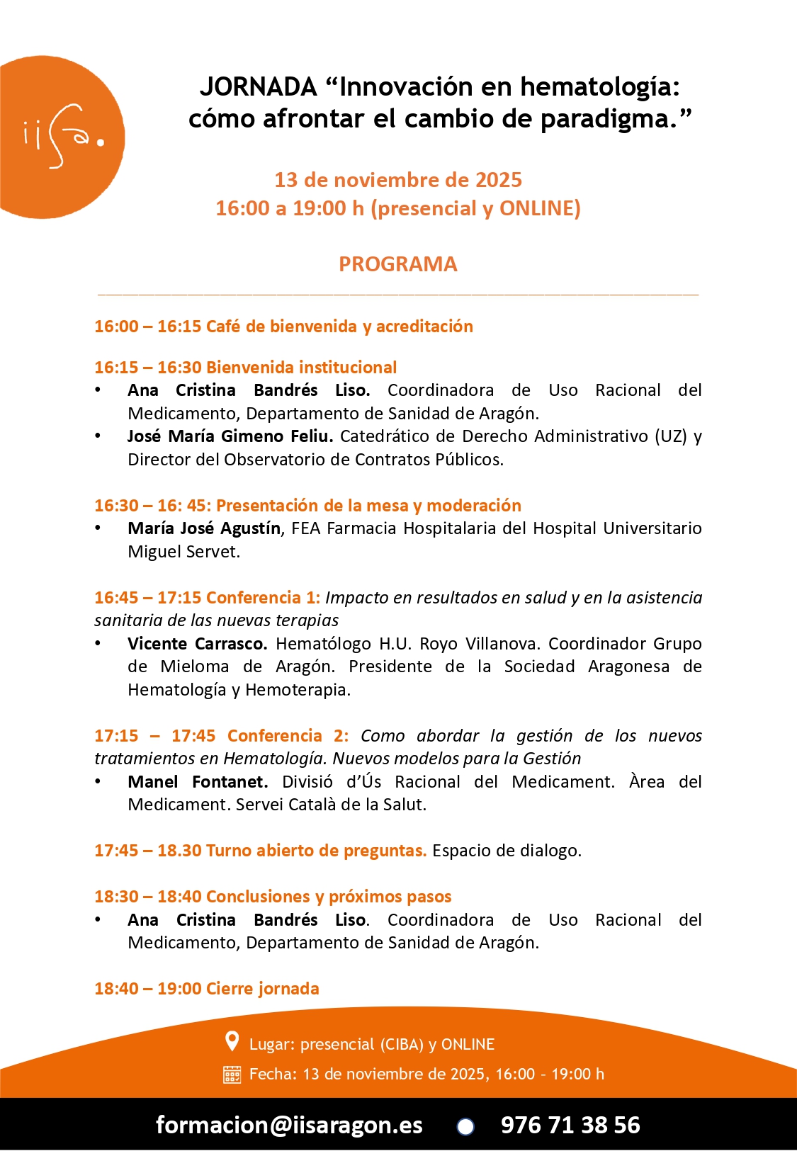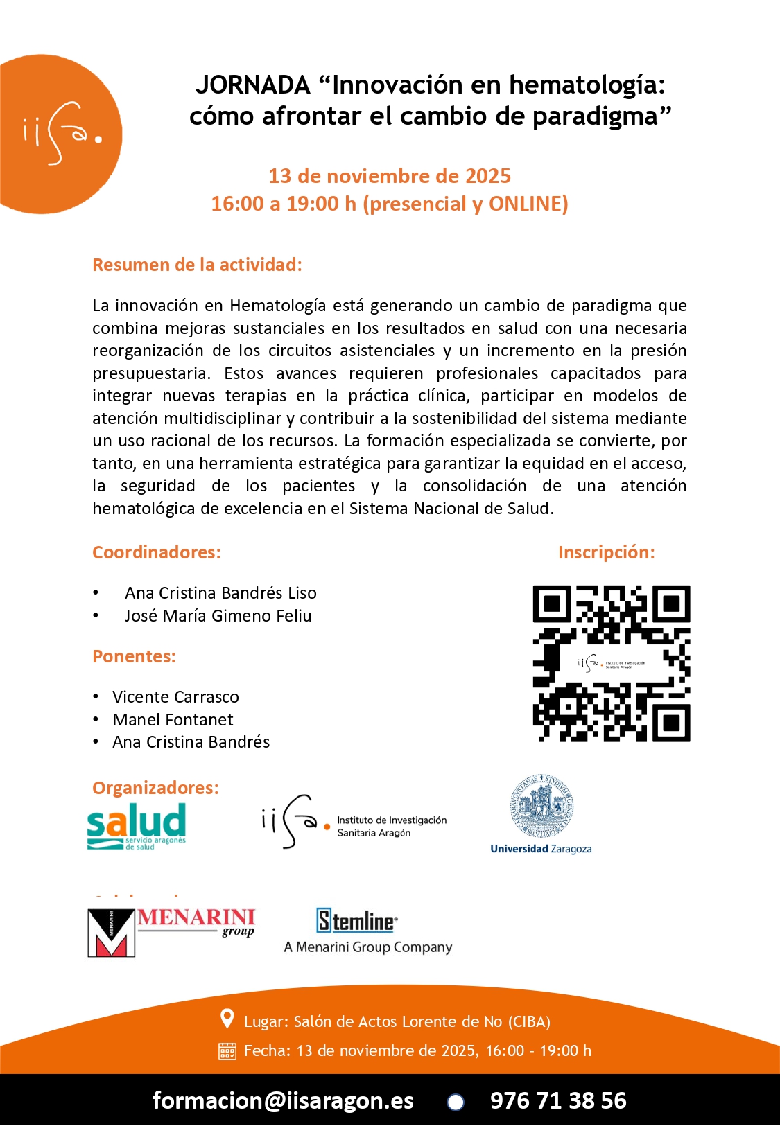 Desde el Instituto de Investigación Sanitaria de Aragón (IIS Aragón) te invitamos a asistir a la jornada «Innovación en hematología: cómo afrontar el cambio de paradigma», que tendrá lugar en formato presencial y online el 13 de noviembre de 2025, de 16:00 a 19:00 h.