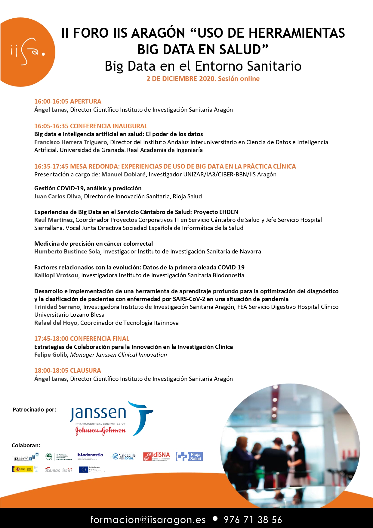 El Instituto de Investigación Sanitaria Aragón (IIS Aragón) en colaboración con el Instituto Andaluz Interuniversitario en Ciencia de Datos e Inteligencia Artificial, la Fundación Rioja Salud, el Servicio Cántabro de Salud, el Instituto de Investigación Sanitaria de Navarra, el Instituto de Investigación Sanitaria Biodonostia e Itainnova y patrocinado por Janssen, organiza el II Foro «Uso de Herramientas Big Data en Salud», que tendrá lugar en formato online el 2 de diciembre de 2020 en horario de 16:00 a 18:05 horas donde se analizarán los últimos avances en la gestión de este tipo de datos en los ámbitos en Salud regionales, nacionales y europeos.