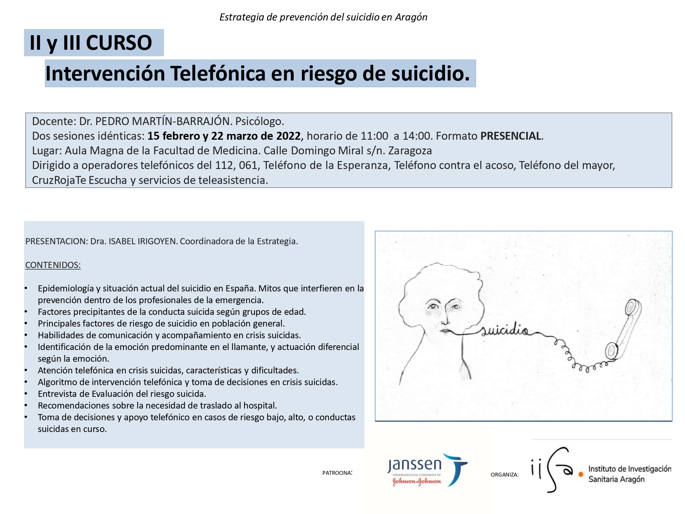 Desde la Estrategia de prevención del suicido en Aragón y dentro del área de prevención destinada al colectivo de personas mayores se han programado la II y III edición del curso «Intervención telefónica en riesgo de suicidio«, que tendrán lugar el 15 de febrero y el 22 de marzo.