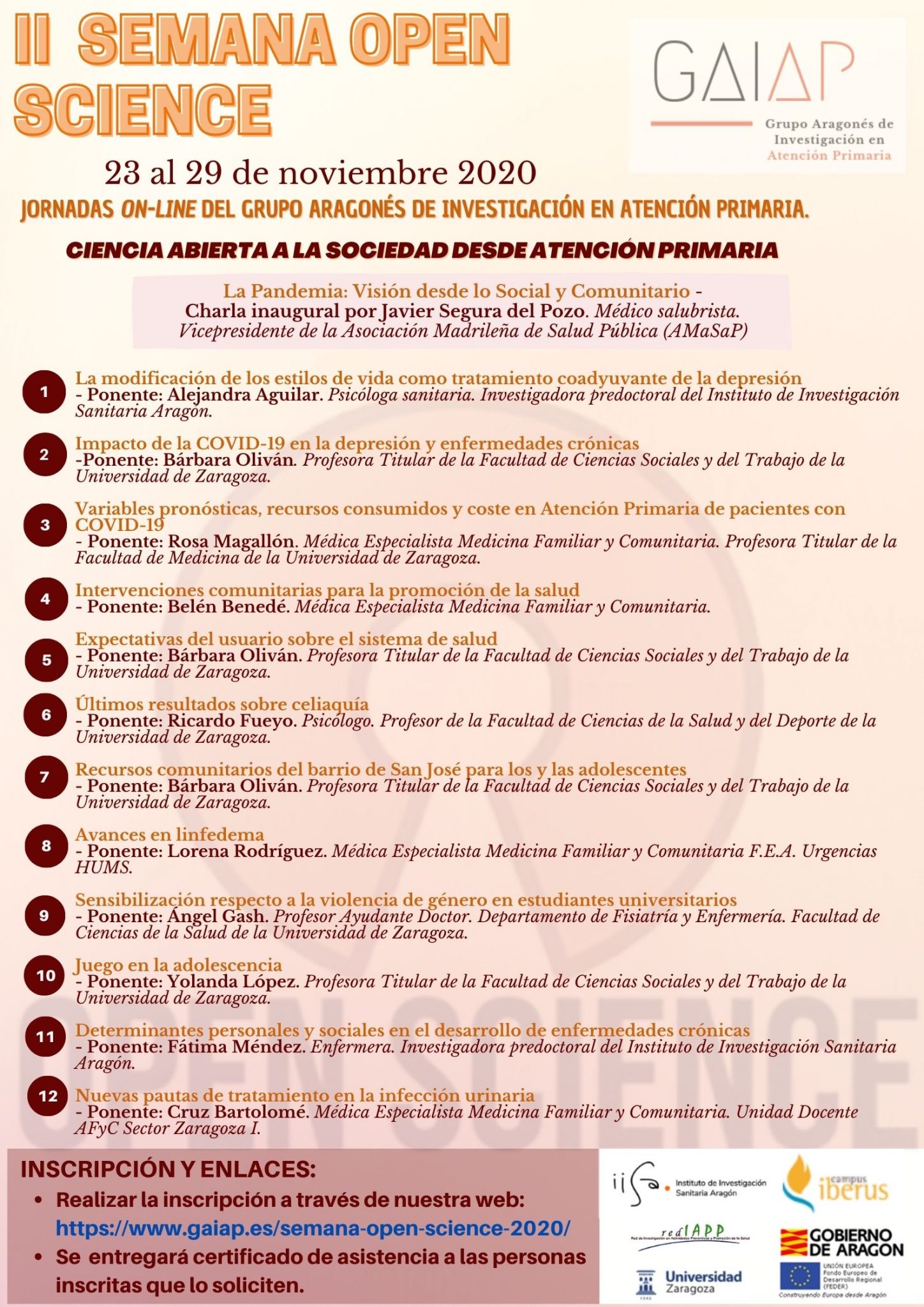 Bienvenidos a la II semana Open Science – Ciencia Abierta organizada por el Grupo Aragonés de Investigación en Atención Primaria (GAIAP). Durante la semana del 23 al 29 de noviembre, se colgarán 11 píldoras de información (vídeos de 5 minutos) en las que explicaremos en qué consisten y qué resultados tenemos (o queremos obtener) de cada una de las investigaciones que tenemos en marcha ¡Estate atento!