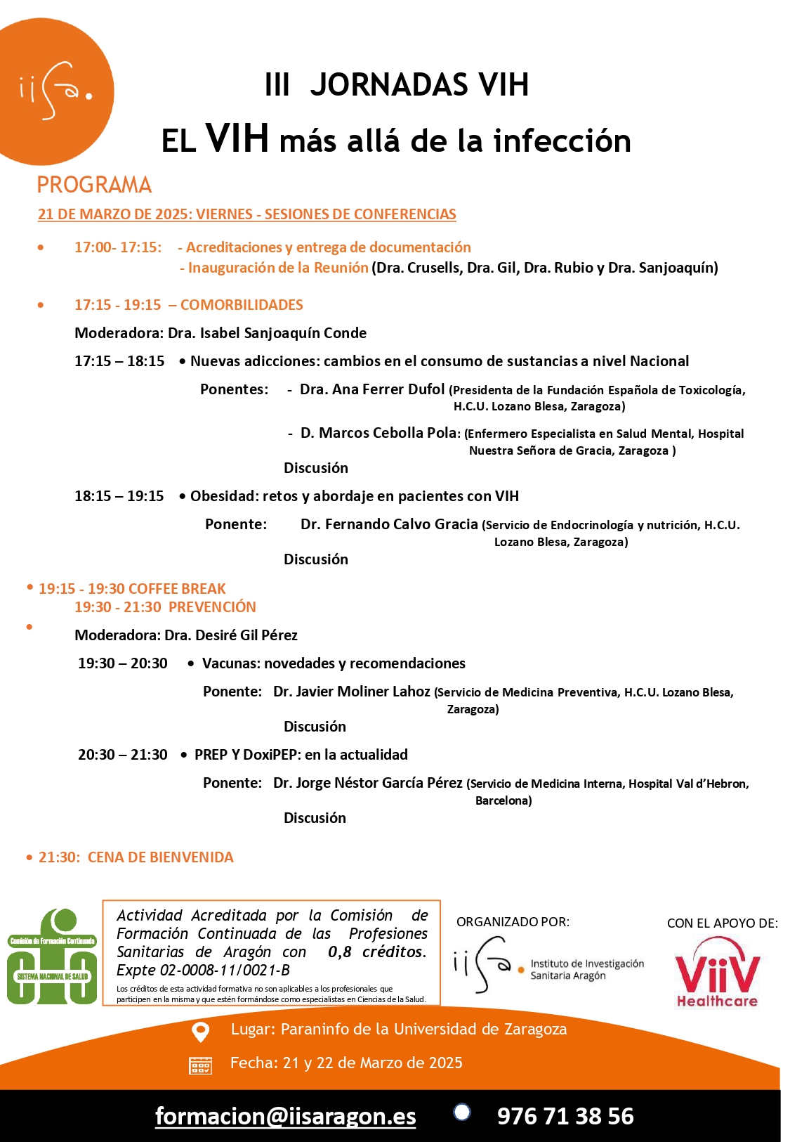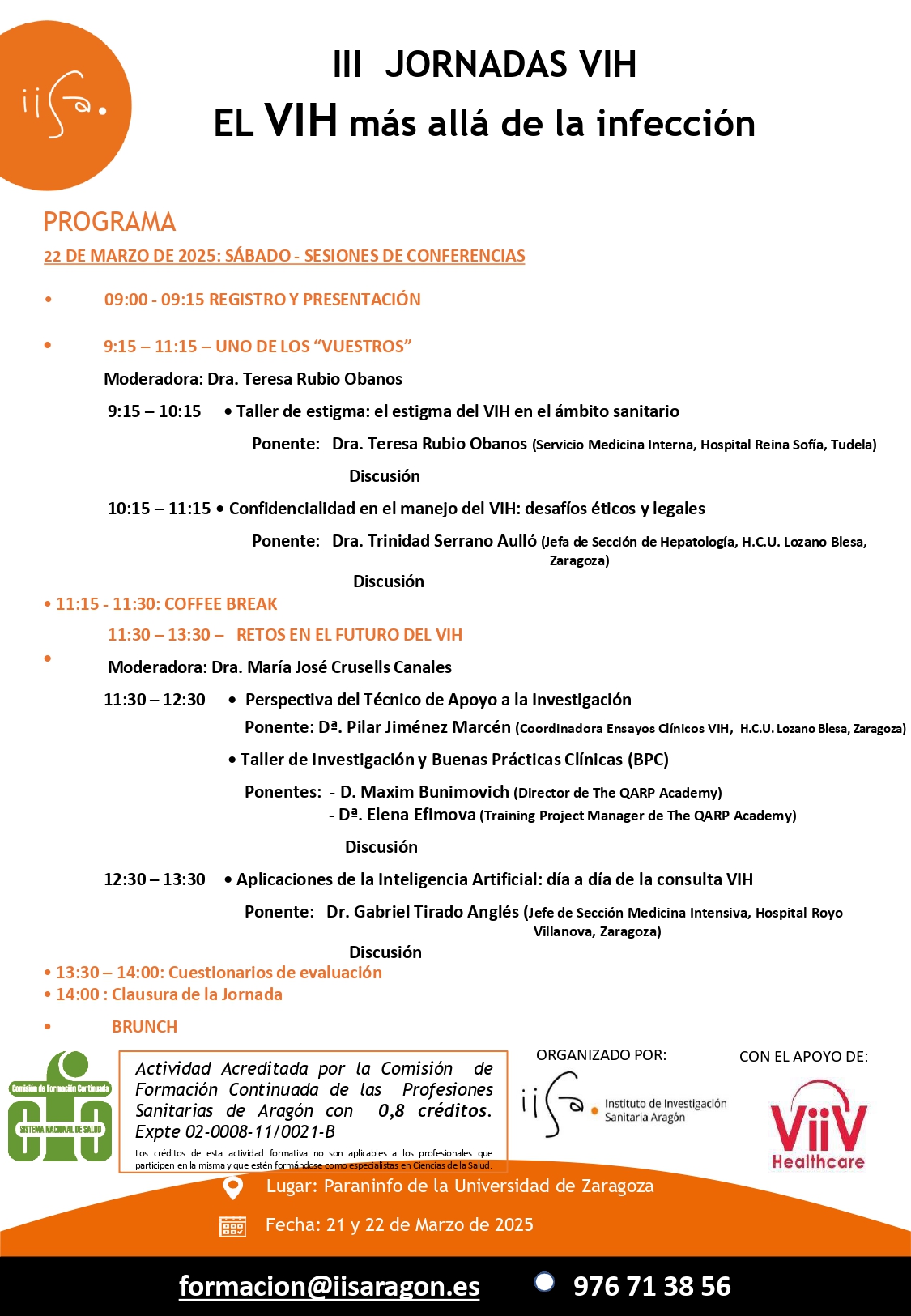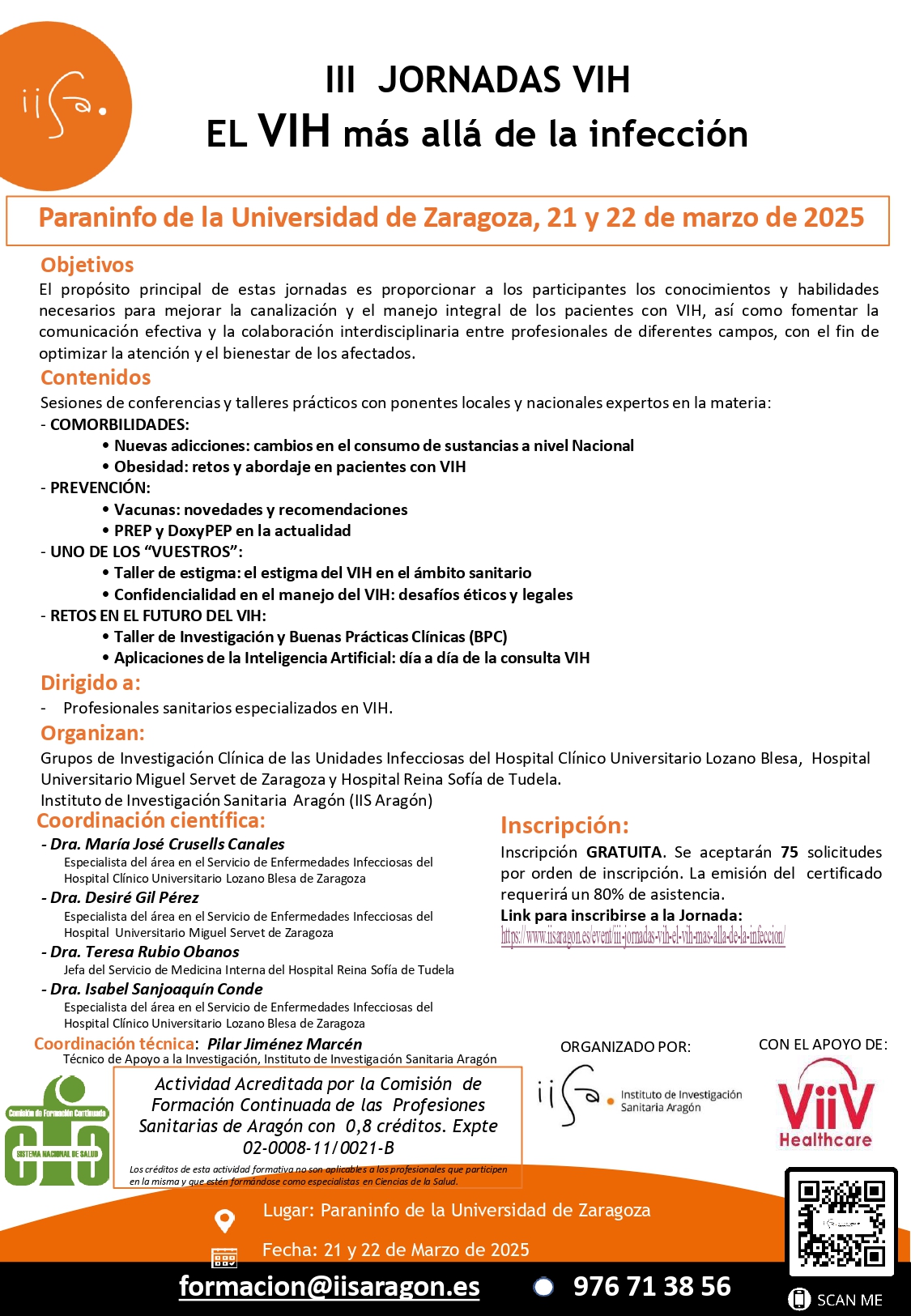 Instituto de Investigación Sanitaria de Aragón (IIS Aragón) en colaboración con los Grupos de Investigación Clínica de las Unidades Infecciosas del Hospital Clínico Universitario Lozano Blesa, Hospital Universitario Miguel Servet de Zaragoza y el Hospital Reina Sofía de Tudela organizan el 21 y 22 de marzo de 2025 en el Paraninfo de la Universidad de Zaragoza: «III JORNADAS VIH EL VIH más allá de la infección»