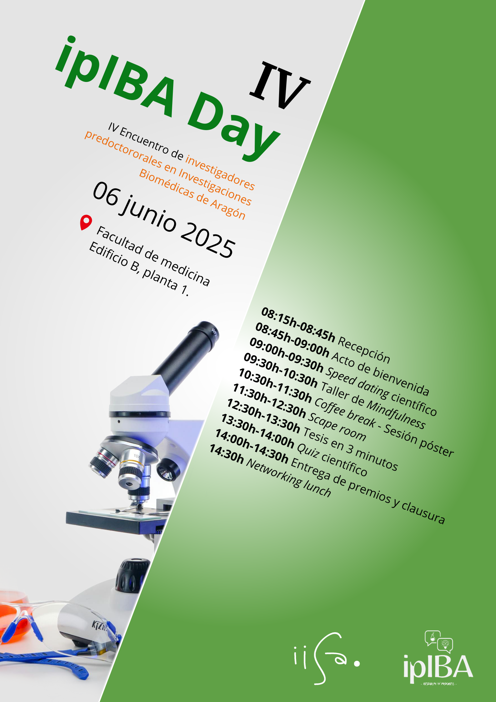 Desde el Instituto de Investigación Sanitaria de Aragón (IIS Aragón) te invitamos a asistir al ipIBA Day 2025: IV Encuentro de investigadores predoctorales en Investigaciones Biomédicas de Aragón, que tendrá lugar el 06 de junio de 2025. Para quienes todavía no conozcáis la iniciativa, el ipIBA Day es una jornada dedicada a todo investigador/a predoctoral que quiera participar, juntarse, hacer networking y difundir sus proyectos.