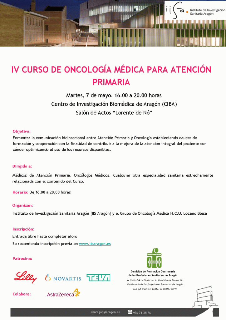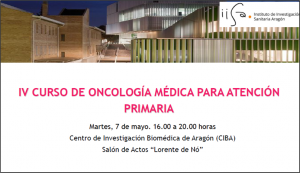 El Instituto de Investigación Sanitaria Aragón (IIS Aragón) en colaboración con el Grupo de Oncología Médica H.C.U. Lozano Blesa organizan el próximo martes, 7 de mayo en horario de 16.00 a 20.00 horas el «Curso de Oncología Médica para Atención Primaria»