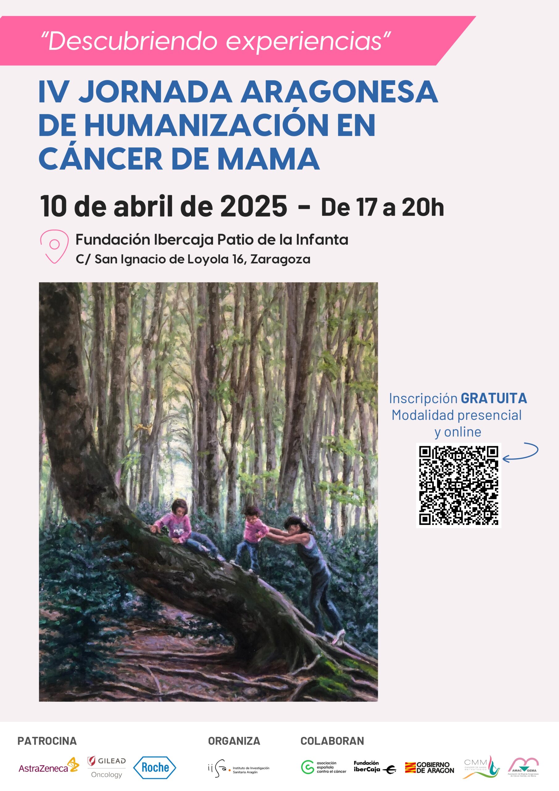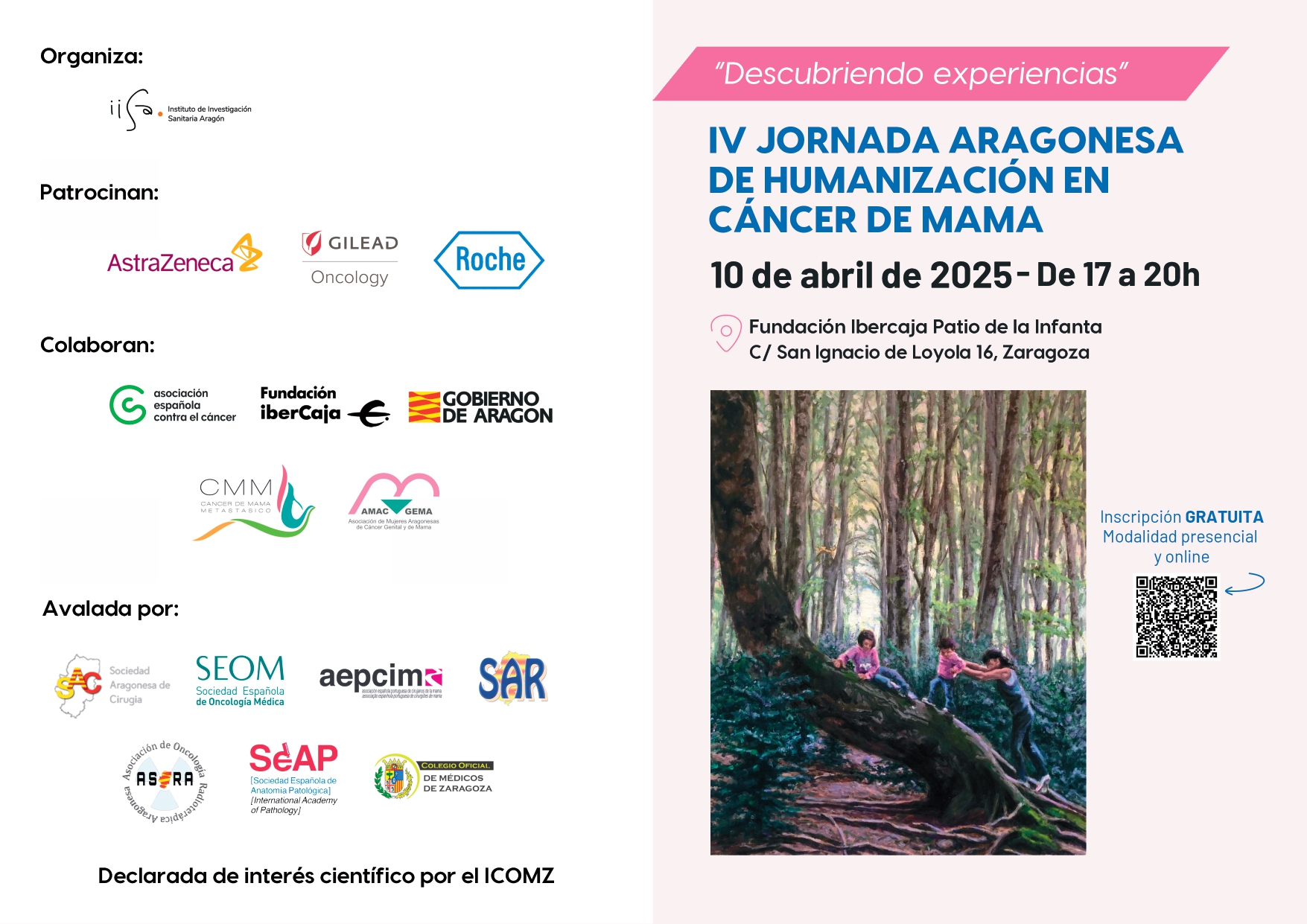 Desde el Instituto de Investigación Sanitaria de Aragón (IIS Aragón) te invitamos a asistir a la IV Jornada Aragonesa de Humanización del Cáncer de Mama, que tendrá lugar el 10 de abril de 2025, de 17 a 20 h. Esta jornada ha sido declarada de interés científico por el ICOMZ.