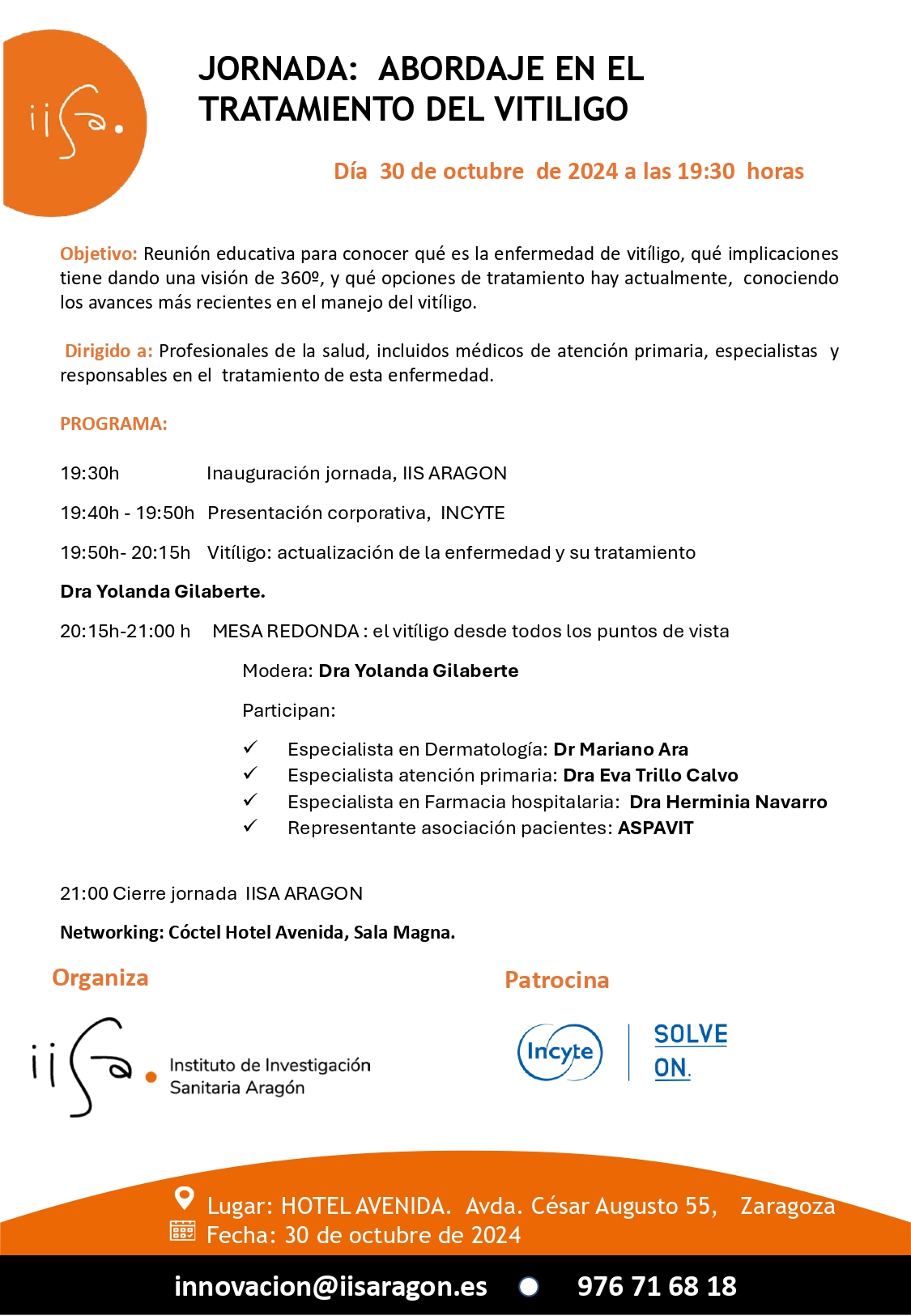 El 30 de octubre de 2024 tendrá lugar la Jornada «Abordaje en el tratamiento del vitíligo», en formato presencial (HOTEL AVENIDA. Avda. César Augusto 55, Zaragoza). El evento se concibe como una reunión educativa para conocer qué es la enfermedad de vitíligo, qué implicaciones tiene dando una visión de 360º, y qué opciones de tratamiento hay actualmente, conociendo los avances más recientes en el manejo del vitíligo.