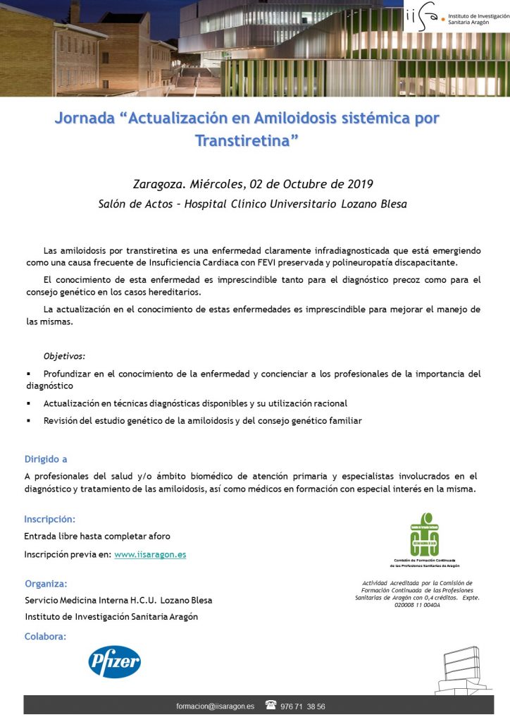 El Servicio de Medicina Interna del H.C.U. Lozano Blesa en colaboración con el Instituto de Investigación Sanitaria Aragón (IIS Aragón), organiza el miércoles, 2 de octubre en horario de 16.00 a 19.30 horas la Jornada «»Amiloidosis genética por mutaciones de gen de la Transtiretina».